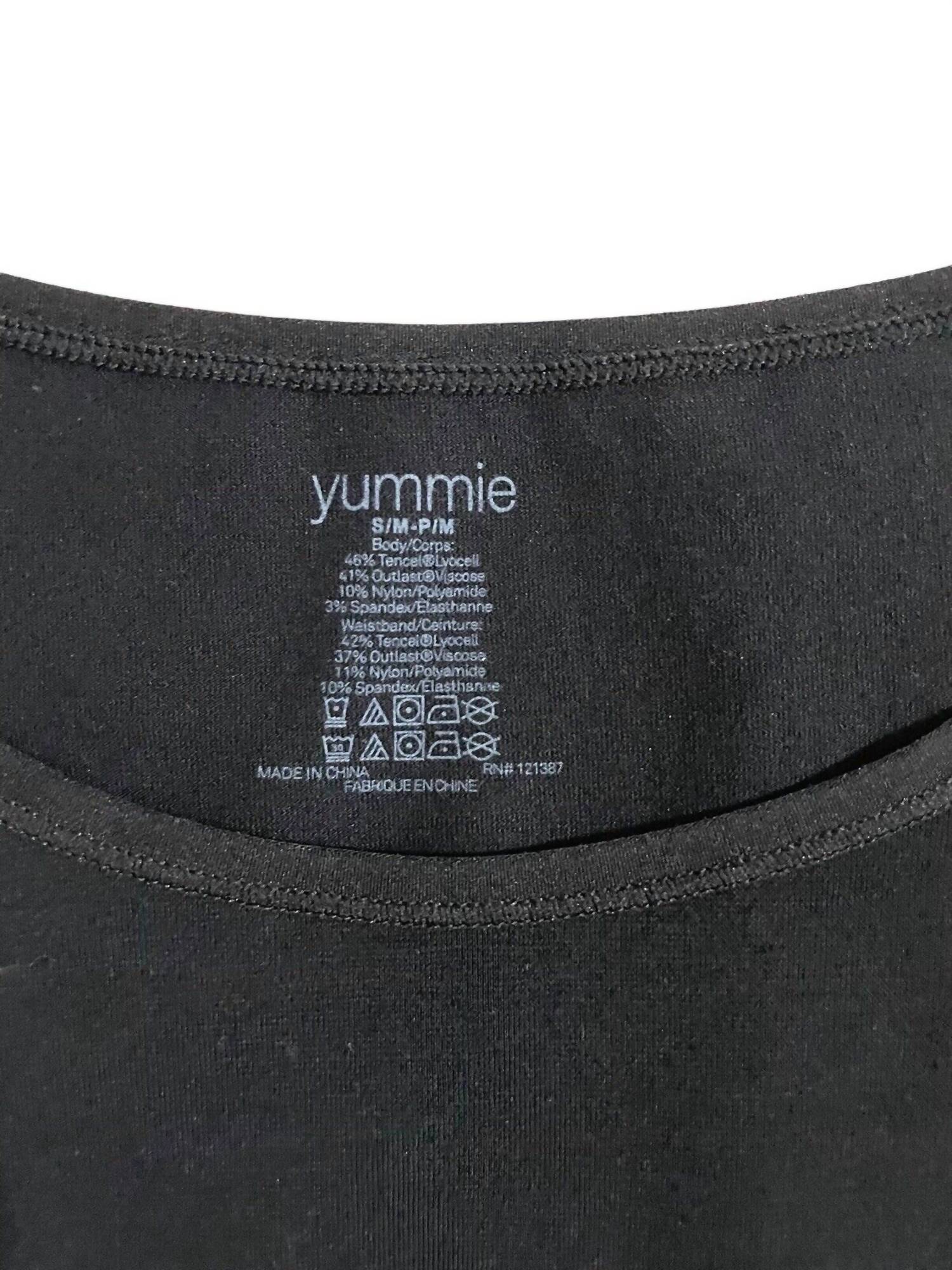 Introducing the Yummie Women's Scoop Neck Thong Bodysuit, a luxurious addition to your basics. This black bodysuit features long sleeves crafted with fantastically soft fabric, ensuring both comfort and warmth. Made from a blend of 46% Tencel, 41% Outlast Polyester, 10% Nylon, and 3.5% Spandex, it contours naturally to your body. With a scoop neckline and convenient snap closure at the crotch, this solid pattern thong bodysuit offers a perfect fit with a length of 24.5" and sleeve length of 24".