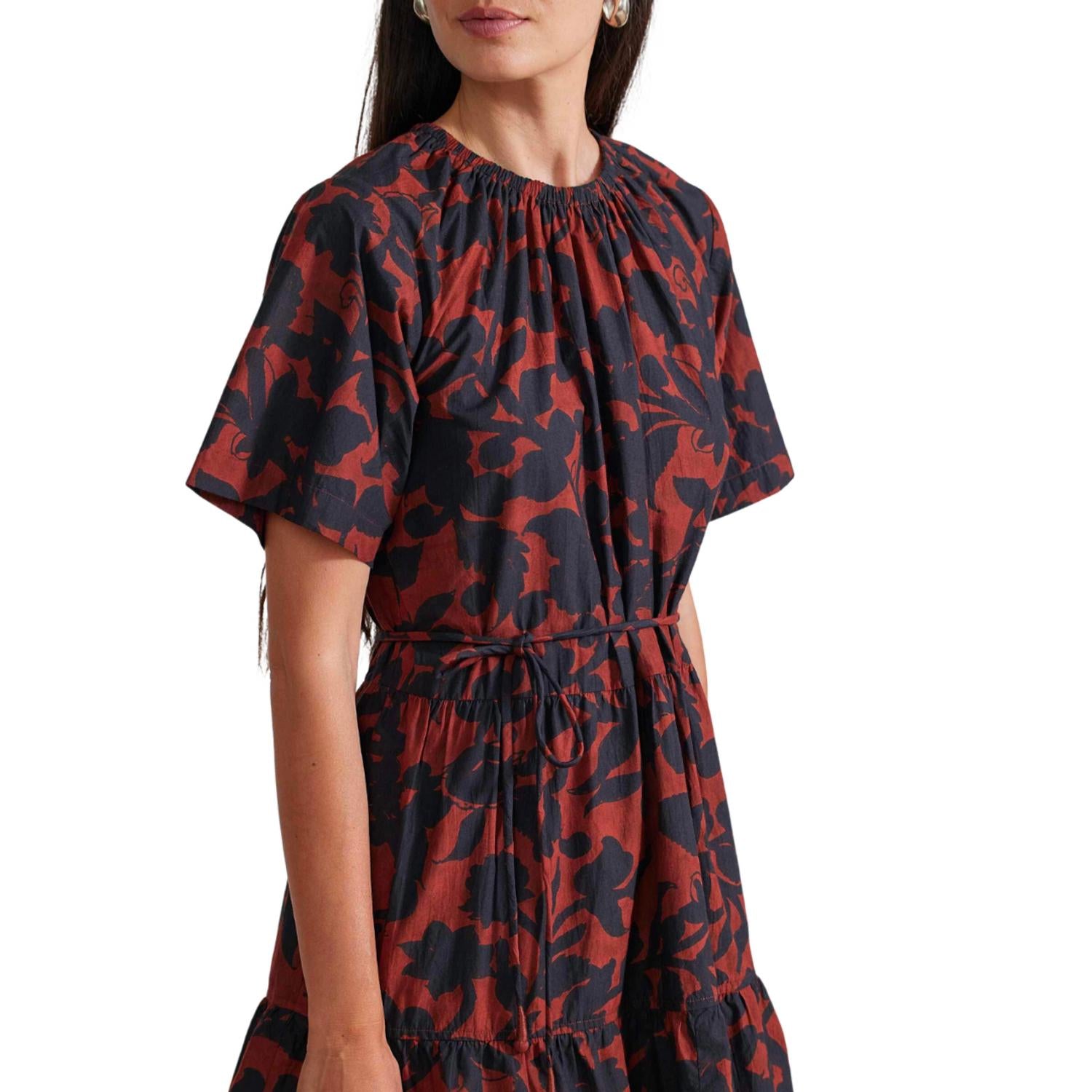 Featuring a removable waist belt, a tiered skirt, side pockets, and a button and loop closure at the back of the neck. Fabric: 100% Regenerative Cotton. Dry clean recommended or hand wash cold. True to size. Made in India. Size S Length 34.5".