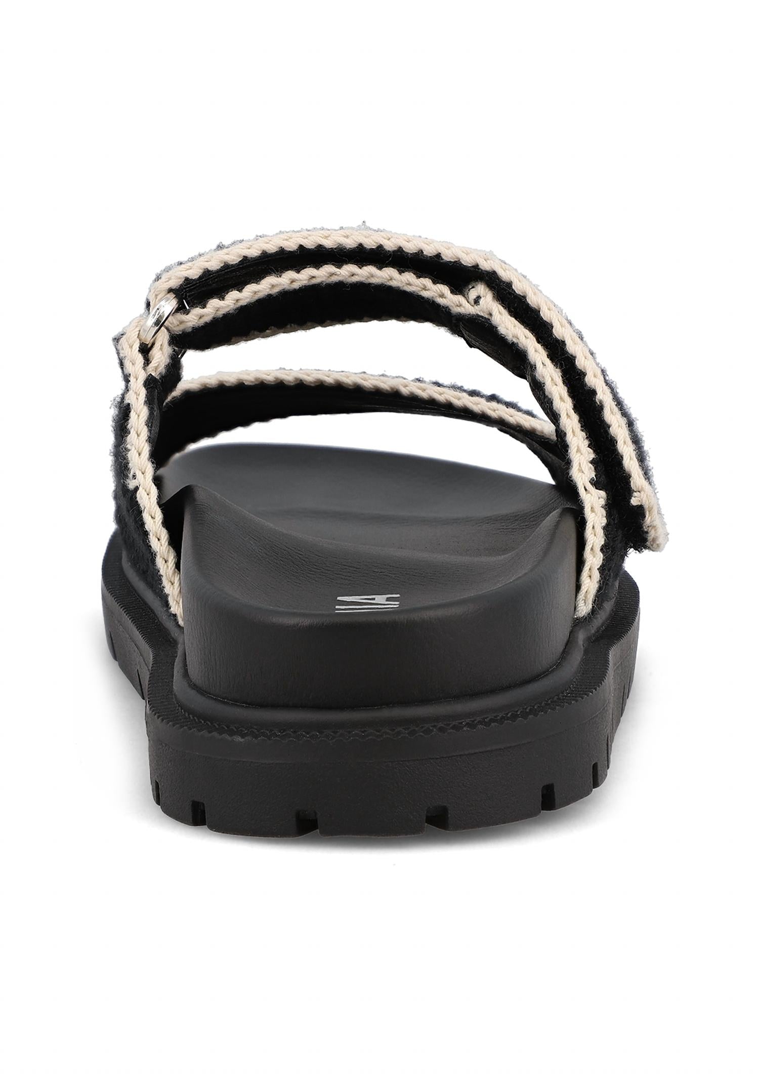 Flowy dresses, cropped pants, and even jumpsuits... this sandal works with them all! Step into summer elegance with the Women's Gabri Sandal by MIA, featuring stitched straps in a striking black and cream contrast. These sandals come with an adjustable hook-and-loop strap and a contoured footbed, ensuring everyday comfort. Constructed from a textile upper with a synthetic lining and sole, they are both minimalist and perfect for a beach day. Originating from an import, these open-toe sandals feature a flat heel ideal for effortless summer styling.