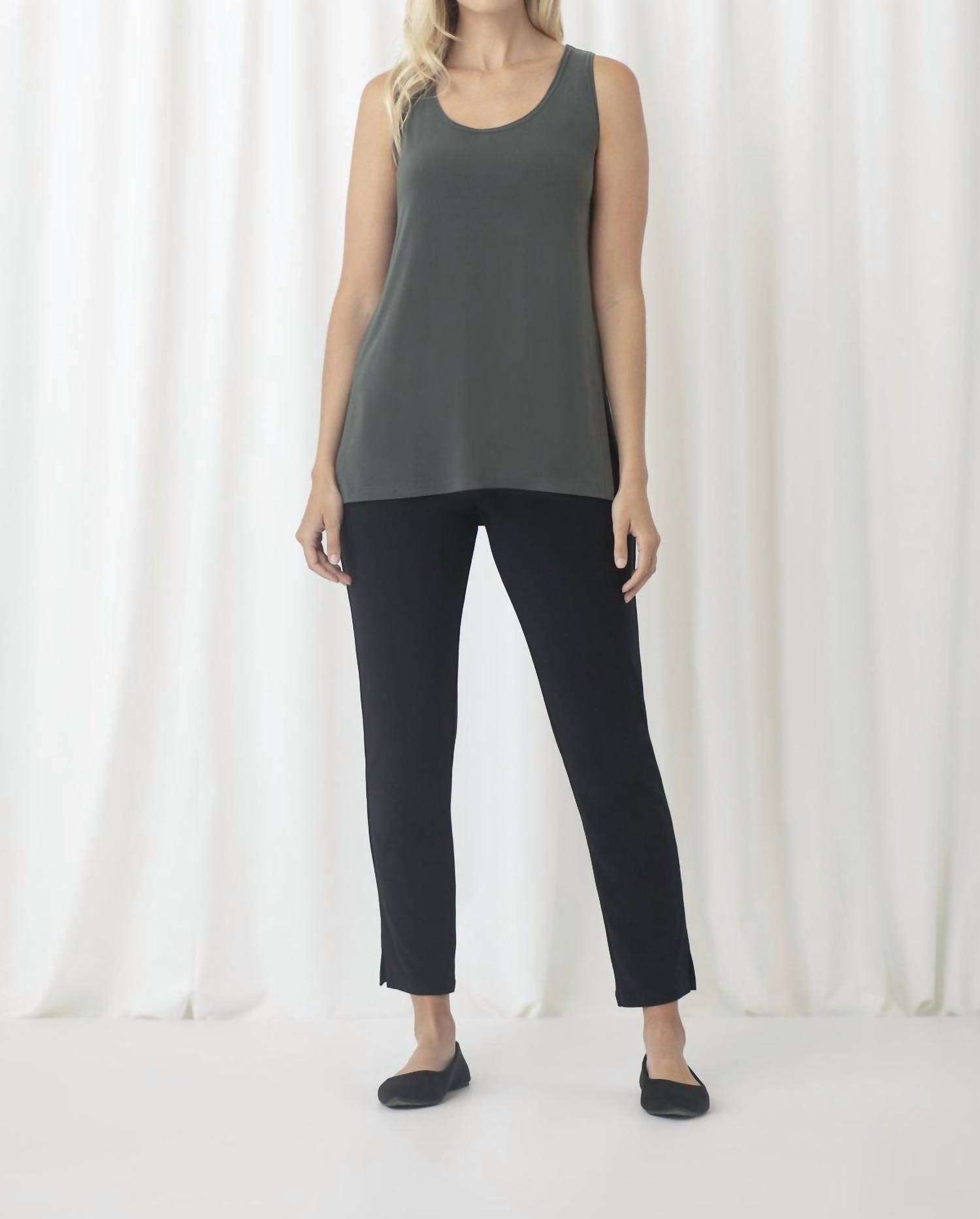 Wear this timeless tank with complete confidence anytime, anywhere - it's a fashion faithful. Our best-selling Go To Tank Relax is a wardrobe staple all year-round. Crafted from our versatile and elevated washable jersey fabric, it has a relaxed fit and just the right amount of stretch. A scoop neckline and flattering side slits. Drapes effortlessly on the body. Proudly Made In Canada. 94% Polyester 6% Spandex. Machine wash cold.