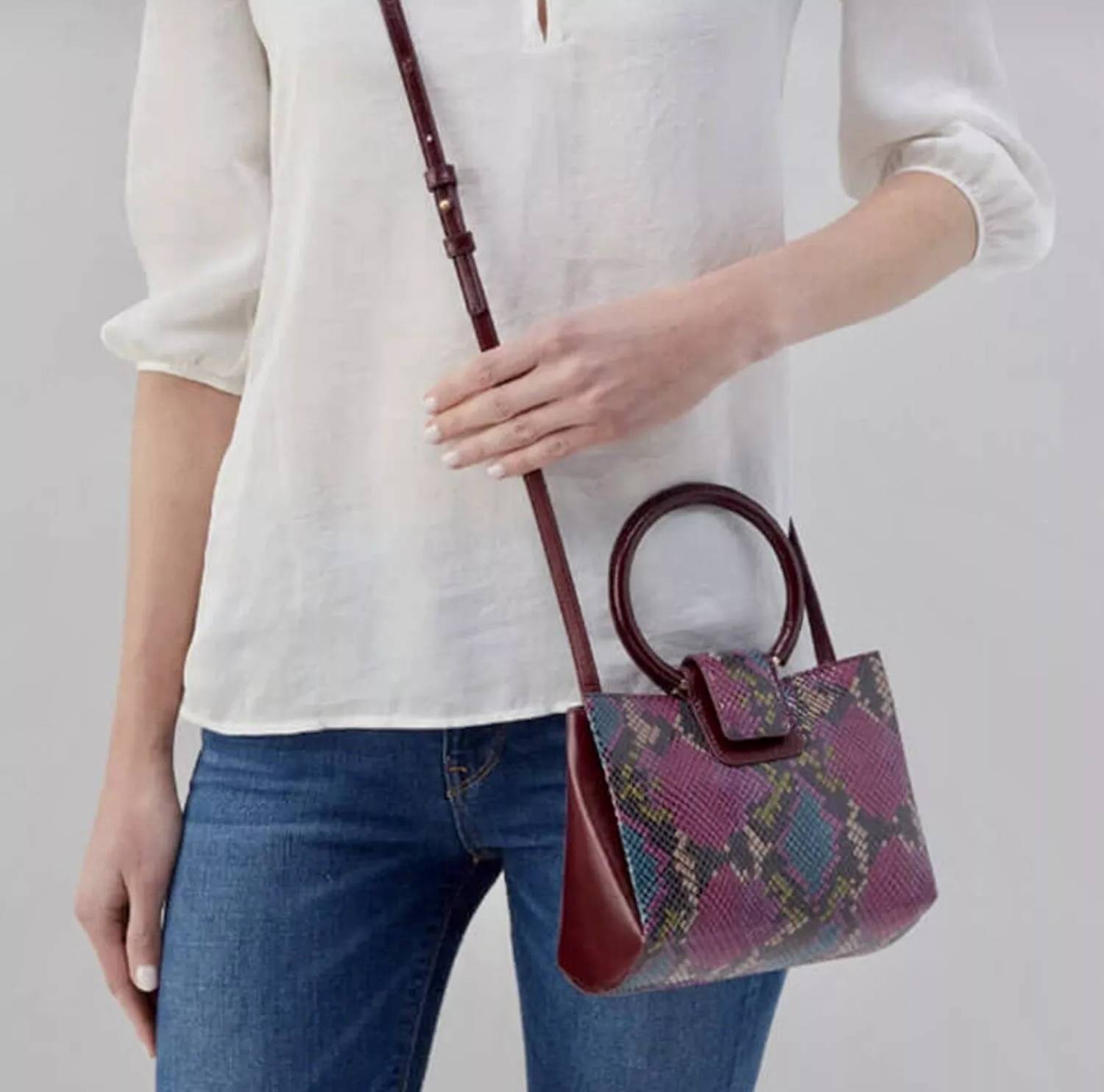 A casual and cute take on everyone's favorite crossbody bag. The Heidi Small Crossbody by HOBO is an essential for hands-free convenience, showcased in a stunning Mosaic Snake hue. This bag marries luxury with casual-cool, crafted from Suede leather, and features an oversized handle with artisanal stitching. It offers practical organization with a snap tab closure, brushed antique brass hardware, and multiple interior pockets, including a zip pocket and three credit card slots. Dimensions are 7" W x 6.5" H x 3.5" D, with a 23" - 26" adjustable strap drop, accommodating your smartphone effortlessly.