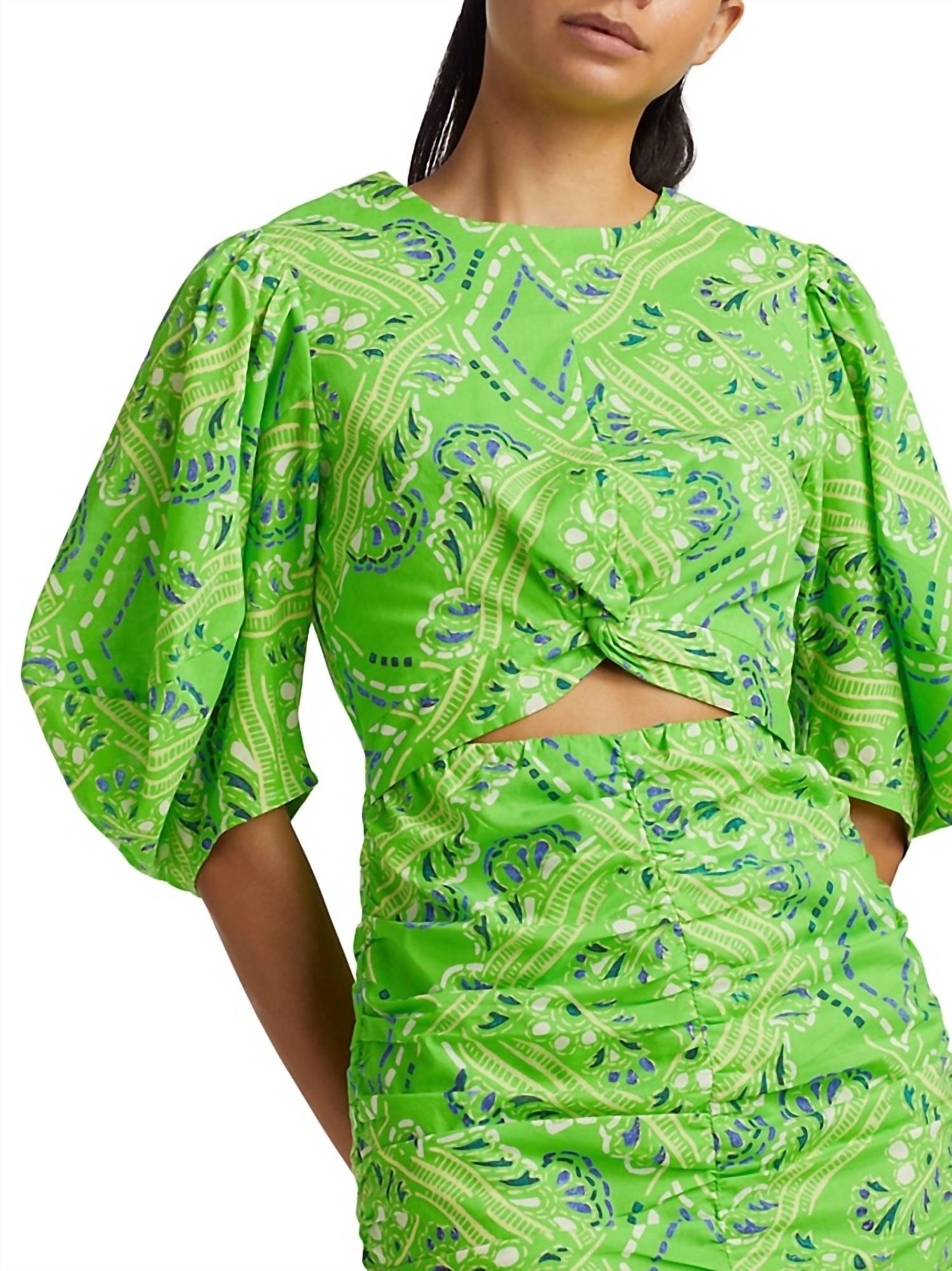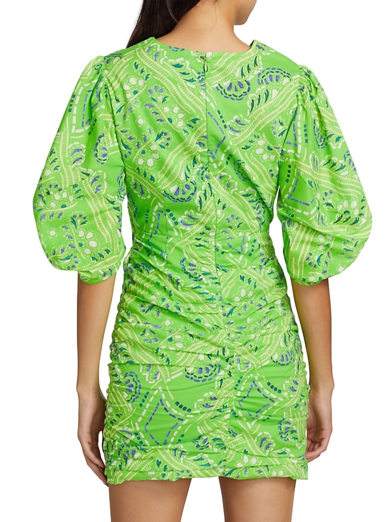 Features a ruched style with a crewneck and short puff sleeves. It has a cut-out front and an elasticized waist, complemented by a back-zip closure. Made from 100% cotton, it is recommended for dry cleaning. The dress measures about 34.75 inches from shoulder to hem. The model is 5'10" tall and is wearing a US size Small.