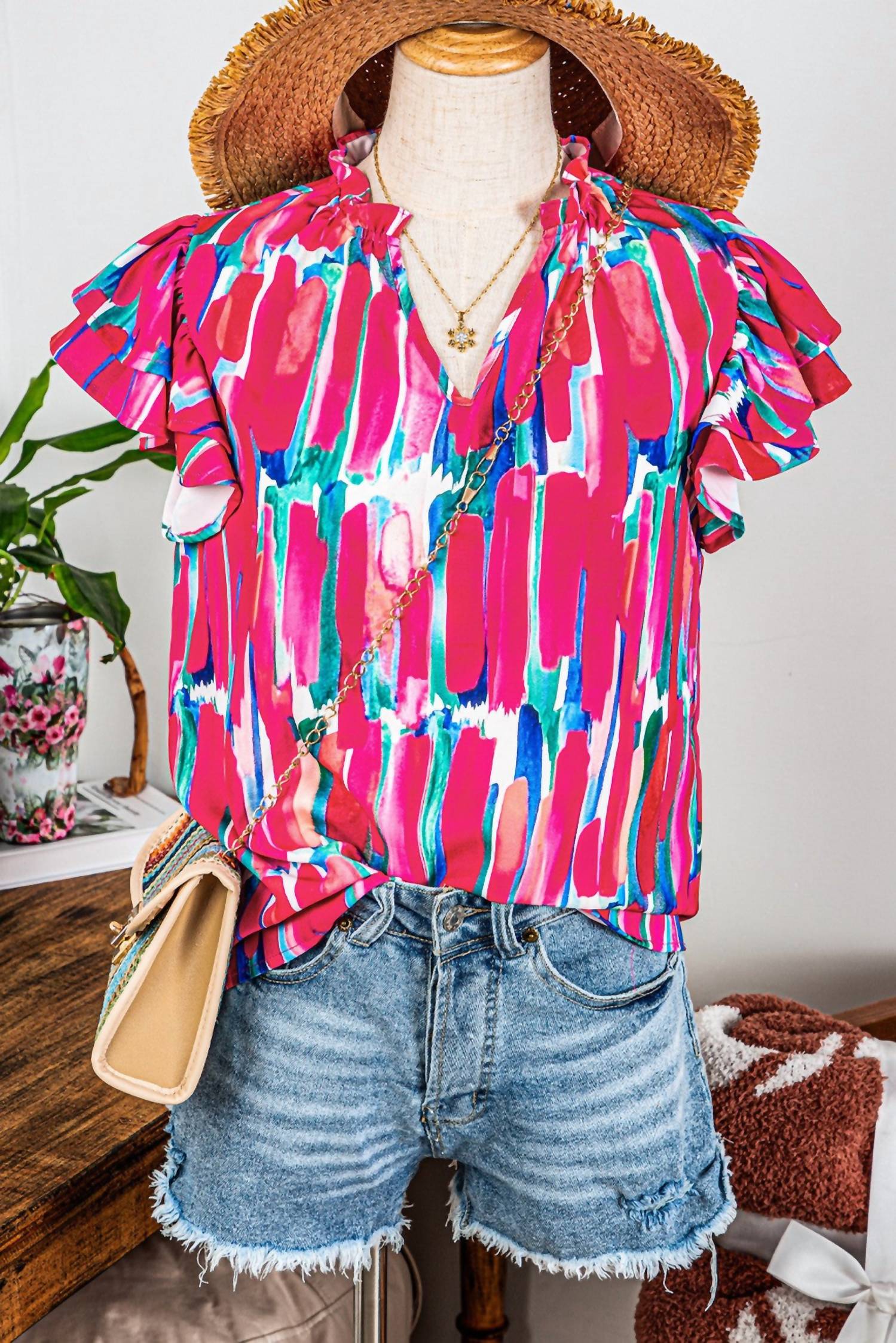 A timeless blouse that will never go out of style. Discover the Boho Abstract Brush Ruffled Sleeve Blouse by Fashionworks, a stylish piece for everyday wear. This casual blouse in rose features a flattering V-neck and cap sleeves with frill and ruffle details. Made from 100% polyester in a shift silhouette, it adds a unique touch to your wardrobe. It runs small with a pull-on closure. Care instructions are hand wash only.