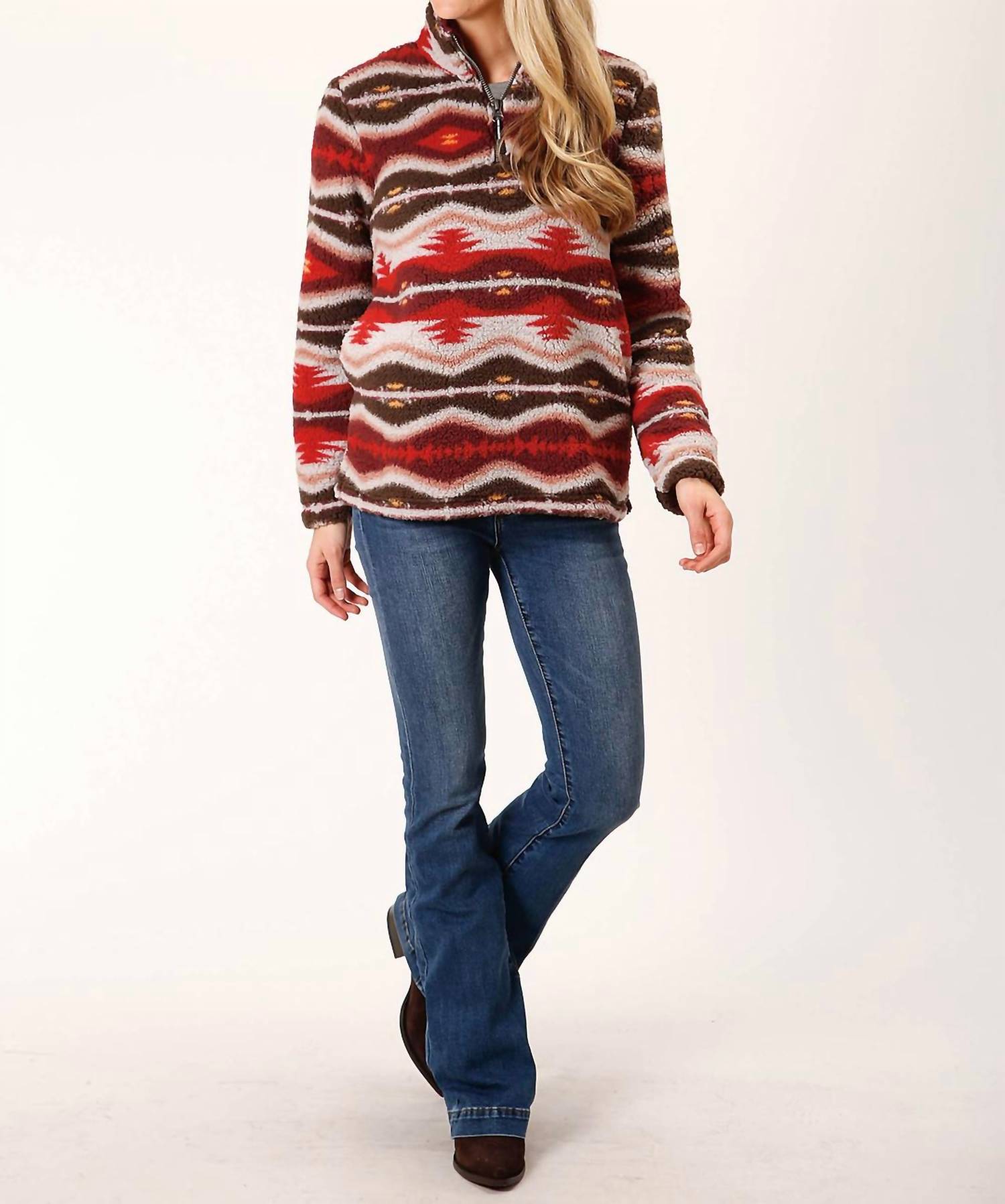 A vest so versatile you can mix and match it with almost any outfit and it will feel brand new every time. Stay warm and stylish with the Women's Polar Fleece Shirt by ROPER, a must-have piece for cooler summer days. Crafted from cozy polyester, this patterned shirt features long sleeves and a classic collar. The practical zip closure ensures easy wear, while its versatile design complements a variety of looks. Ideal for embracing the Western trend, it offers comfort and functionality without pockets.