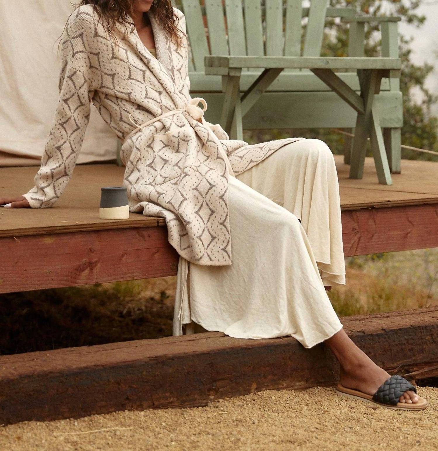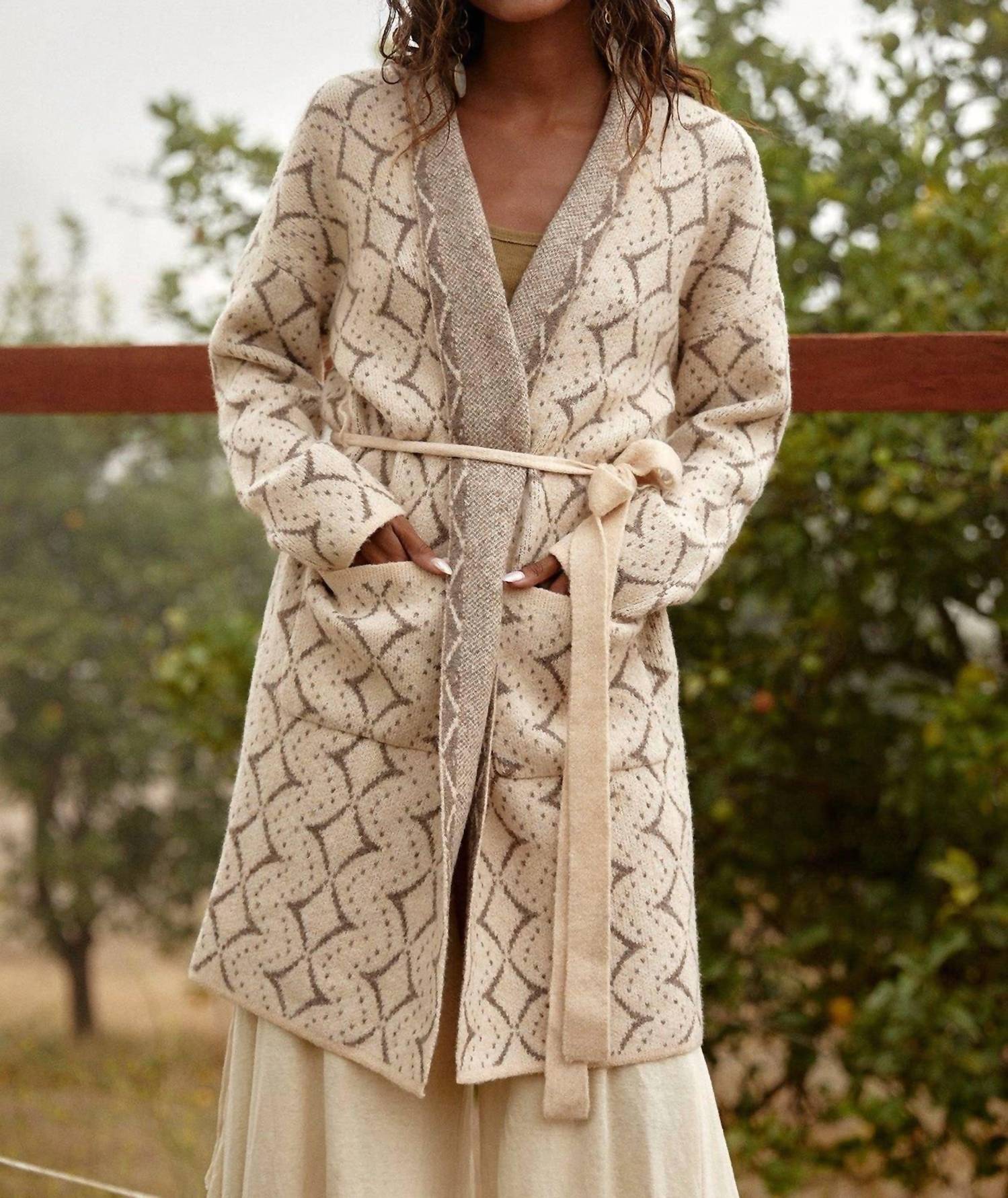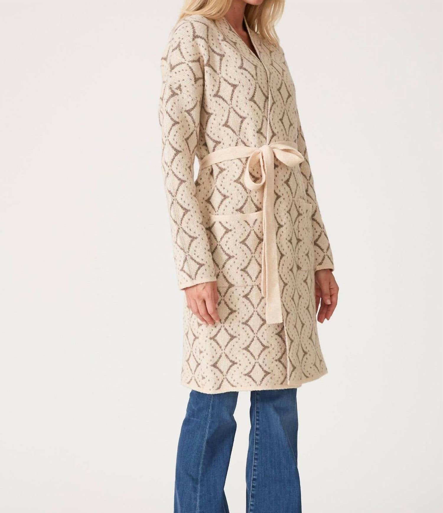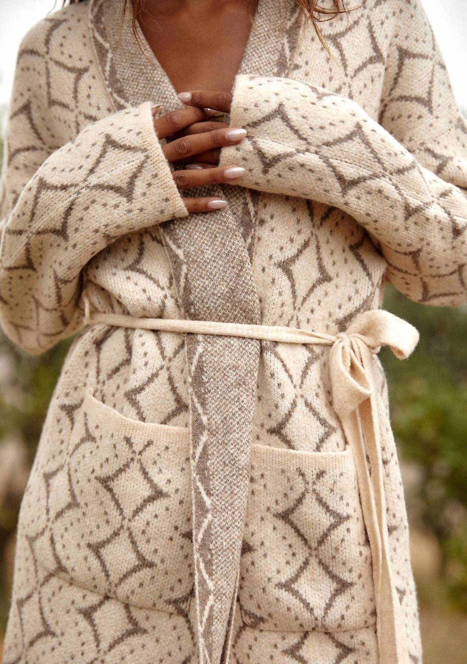 This cardigan will be a sweater-rotation favorite. The LOVESTITCH Western Diamond Jacquard Belted Cardigan is crafted with intricate patterns, offering both comfort and style for the Fall season. Made of acrylic, this long sleeve cardigan in natural taupe features an open front with practical patch pockets and a tie closure for a customizable fit. The V-neckline enhances its cozy appeal, making it a quintessential piece for cool weather. Available with an adjustable waist belt, this cardigan is a must-have for effortless layering.