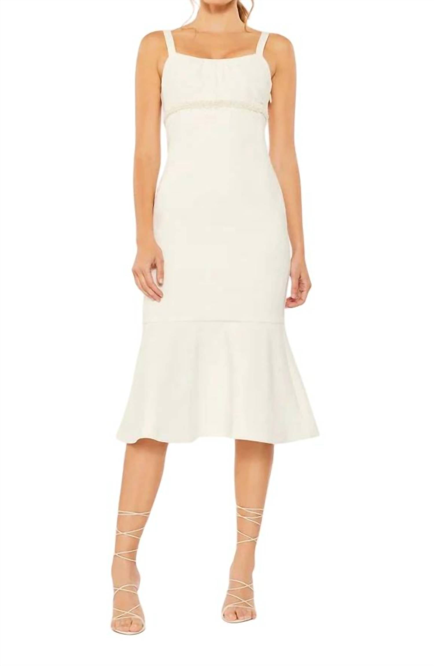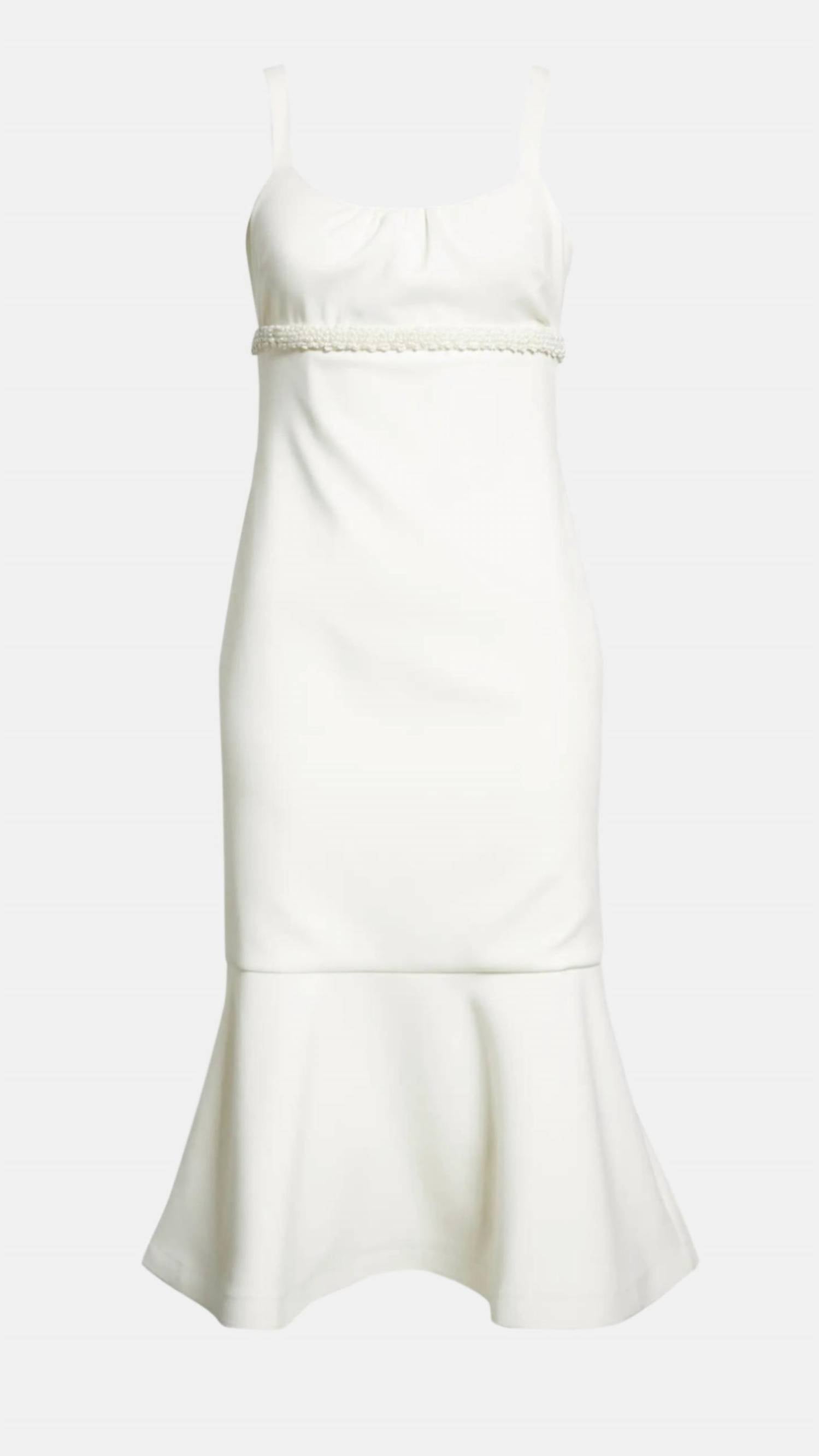 This Lane Pearl Trumpet Midi Dress features a sleeveless fit-and-flare silhouette with a scoop neckline and pearl embellishments. Made from a 67% Polyester, 27% Rayon, 6% Spandex blend, it measures 40.25” in length with a pull-on design. Dry clean only.