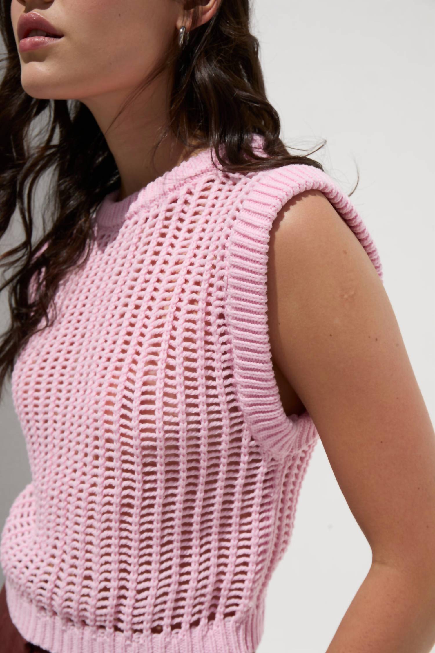 Pair this crop top with your favorite high-waisted jeans or maxi skirt. Introducing the Boetti Knit Top by DELUC, a chic and trendy addition to your summer wardrobe. This cotton blend crop top in a delightful pink features a sleeveless design with a textured openwork knit and a classic crewneck. The comfortable relaxed fit and pull-on closure make it perfect for a day of vacation relaxation or a stylish Easter outing. Composition: 60% Cotton, 40% Acrylic.