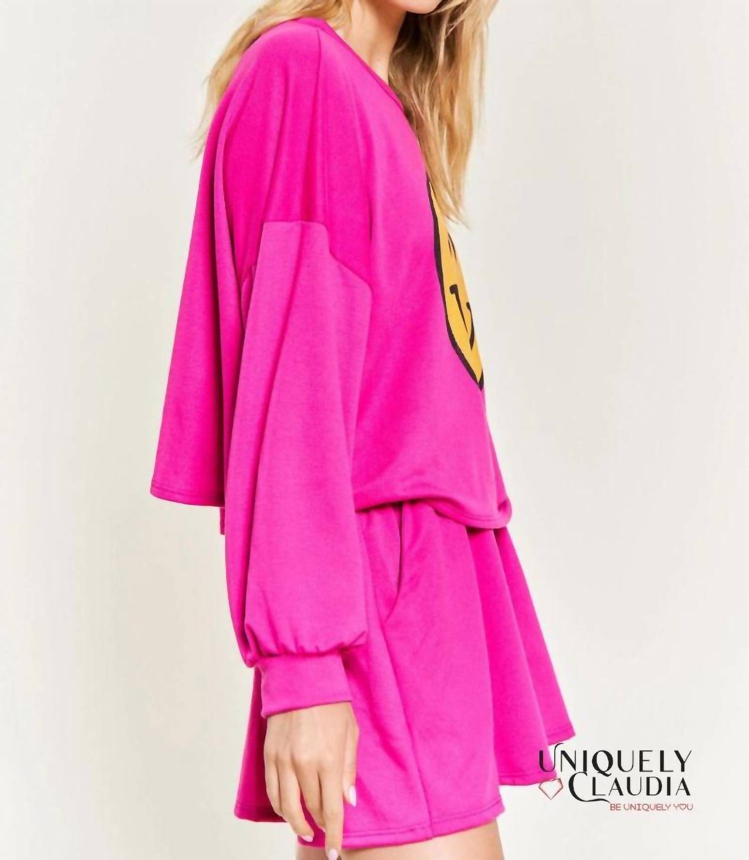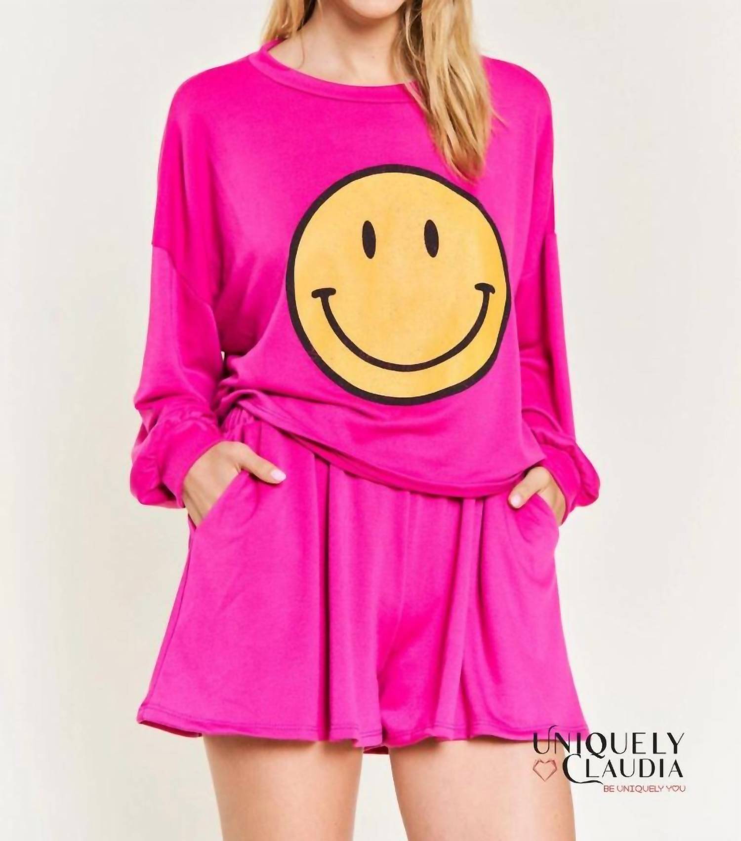Loungewear doesn't have to be frumpy and this is exactly what we had in mind. Designed for a comfortable fit, this chic little number will be your favorite lounging-at-home look. Introducing the Happy For Your Short and Top Set by JADE BY JANE, a vibrant loungewear choice for women in striking fuchsia. The long sleeve crop top features a crewneck and is paired with shorts that include a drawstring waist for a customized fit, along with an elastic waistband and a pocket for added functionality. Made from 100% cotton and crafted in the USA, this graphic set promises both comfort and style. Care instructions: Hand wash cold, do not bleach, tumble dry on low heat.