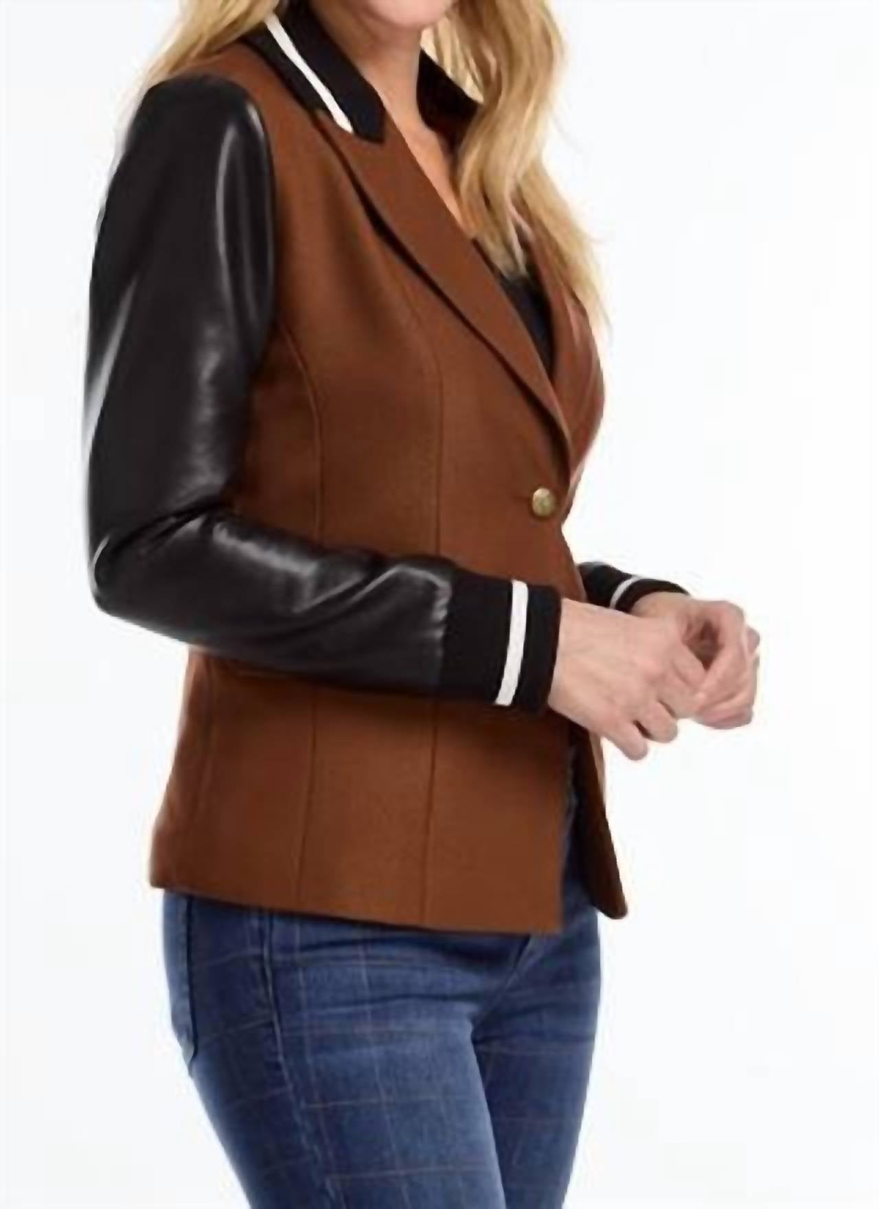 An elevated version of your favorite classic blazer. Bold statement piece in Espresso. Combines the warmth of a jacket with the styling of a blazer. Featuring long contrasting sleeves in faux leather complemented by ribbed fabric cuffs and a collar. Expertly crafted with 66% Polyester, 28% Viscose, and 6% Elastane. Offers a comfortable fit and is finished with a traditional button closure and front flap pockets. Care instructions include hand washing in cold water, avoiding bleach, hanging to dry, and dry cleaning if desired.