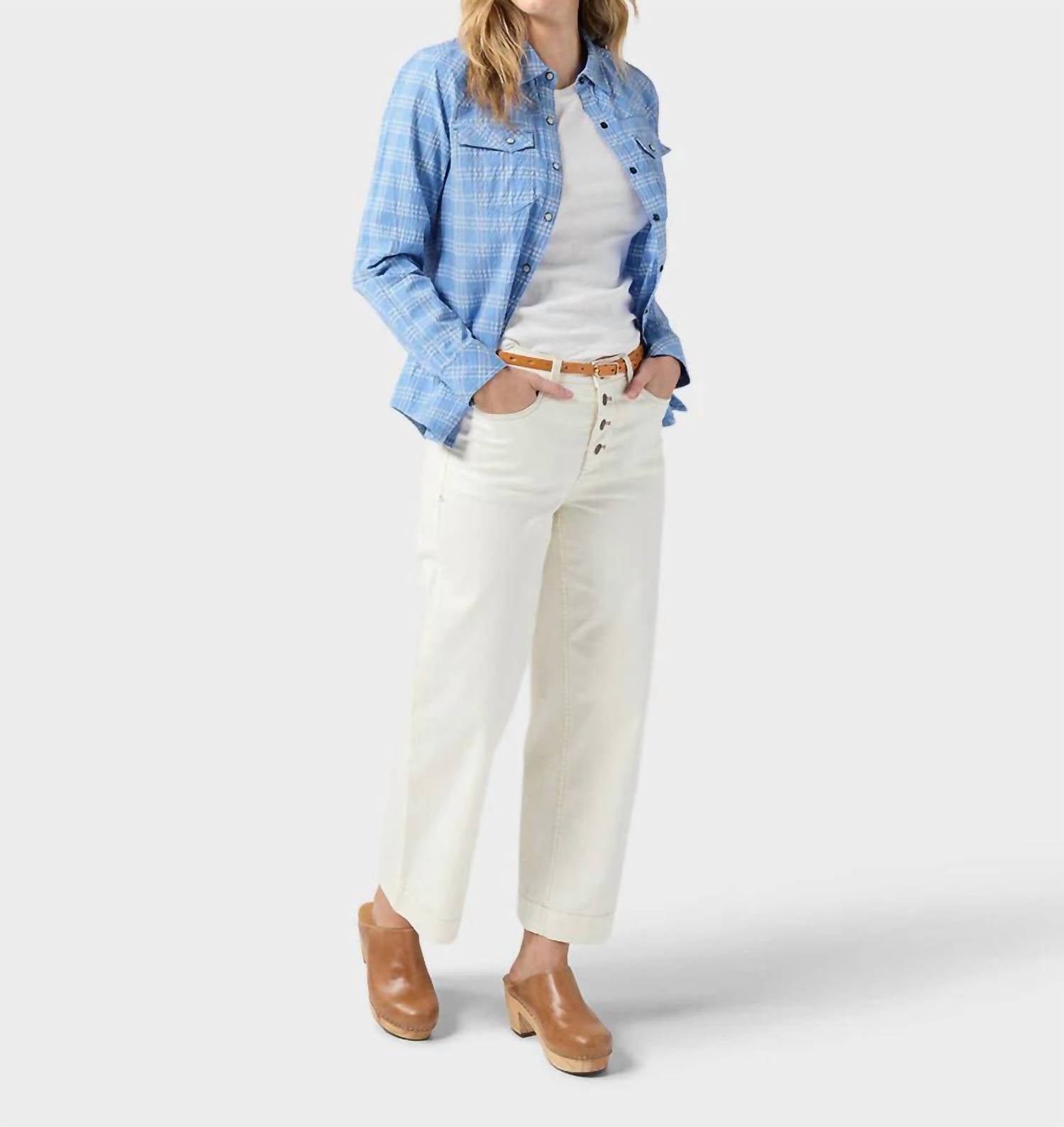 Great fit, cute design, soft fabric. You'll love everything about this long sleeve tee. Experience the Women's Eddy Coast Shirt by Stio, a perfect blend of style and functionality in chicory flower plaid. This long sleeve shirt is crafted from seersucker fabric with a cotton composition, offering sun protection, wind-and-water resistance, and a hint of stretch for comfort and mobility. Designed with a regular fit, it has a center back length of 30 inches, and features custom Stio pearl snaps on the adjustable cuffs and chest pockets for a nod to mountain-town roots. Made in Vietnam, this shirt is perfect for summer streetwear and vacation occasions.
