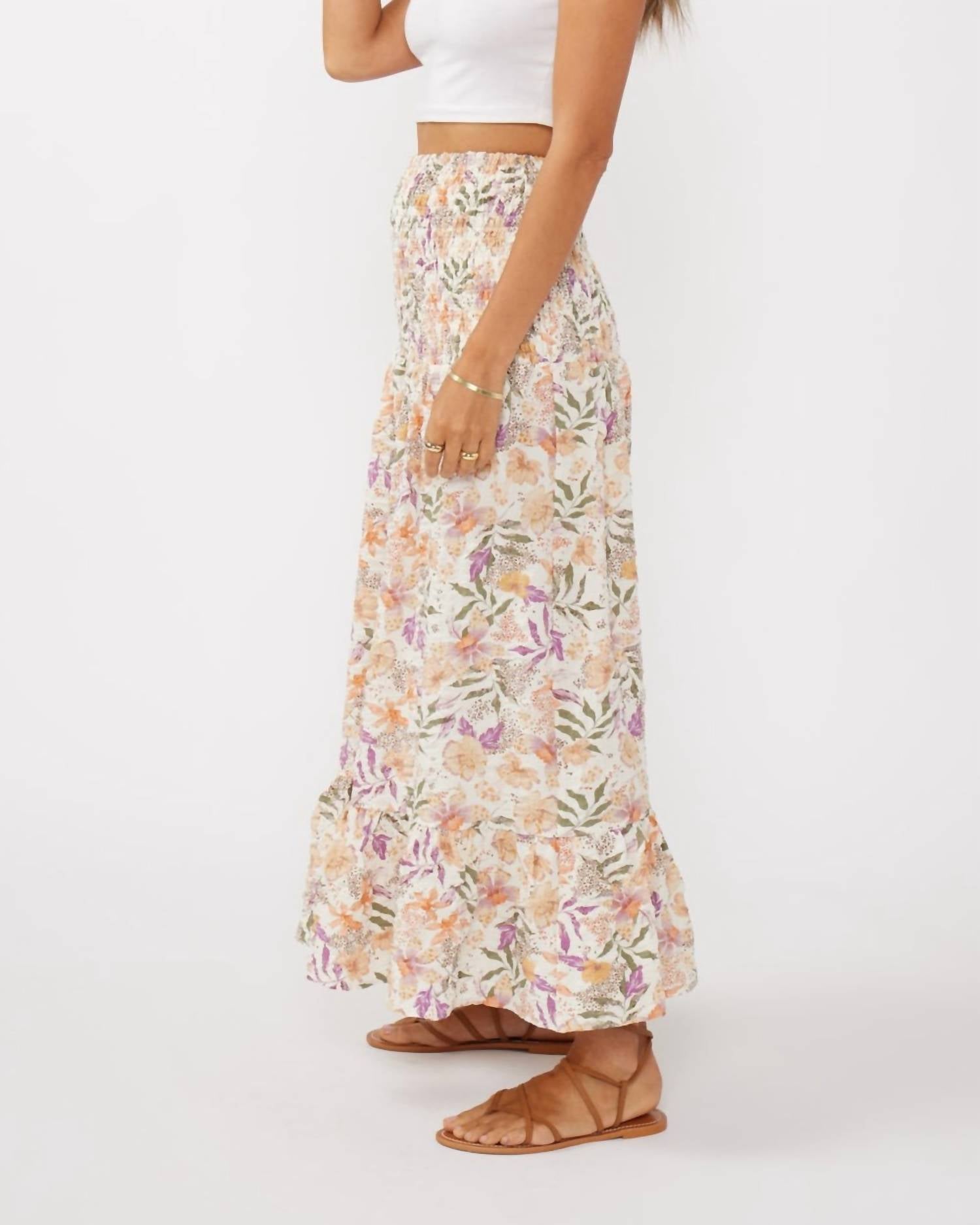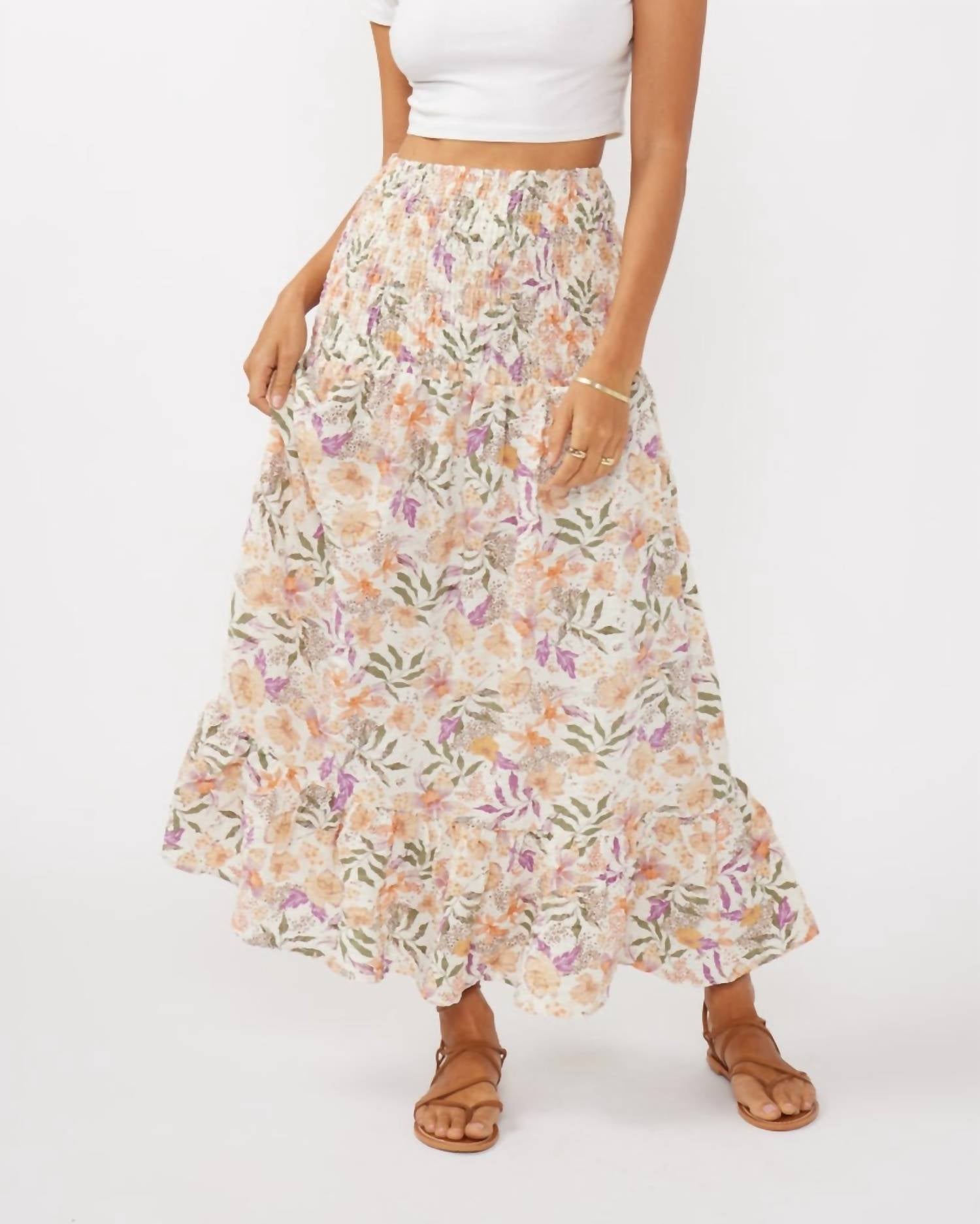 Tuck in your favorite tee for a more casual yet feminine look. The Convertible Floral Smocked Skirt by LOVESTITCH is a versatile must-have for your spring wardrobe. With its feminine floral pattern in cream and dusty lilac, this piece can serve as both a maxi skirt and a dress, making it perfect for vacation or a boho chic Cinco De Mayo celebration. Crafted from 97% polyester and 3% spandex, it offers a comfortable fit with its pull-on closure design. Designed for women with no pockets, it emphasizes a seamless, playful style. Model is 5'9" wearing a size small.