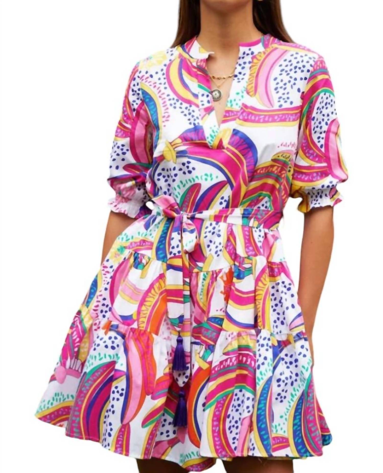 Effortless elegance in the enchanting Bora Bora color. Promises unmatched versatility. Crafted from 100% cotton. Delicate 3/4 length sleeves feature elasticated cuffs. Imbue a sense of refined sophistication. Comes with a detachable belt, adorned with playful tassels. Allowing you to cinch your waist and showcase a flattering silhouette. Charming pattern enhances its visual appeal. Functional pockets add a practical touch. V-neckline design and convenient pull-on closure. Stunning shift silhouette.