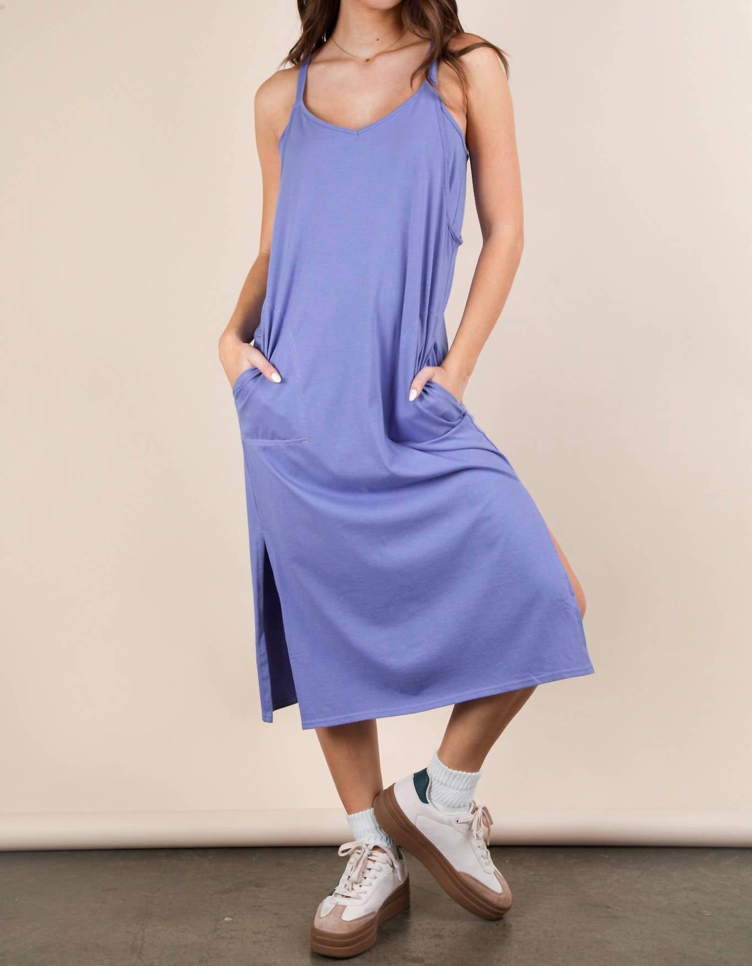 Just add slides or mules and you are good to go. Get ready for summer with the V Neck Sleeveless Casual Comfy Midi Dress by VERY J, a must-have for any vacation wardrobe. This blue, solid-patterned dress is designed with a V-neck and shift silhouette for ultimate comfort and effortless style. Featuring side pockets and a side slit, it offers practicality combined with a chic Y2K trend. Closure: Pull on. Model is 5'8" and is wearing a size small.