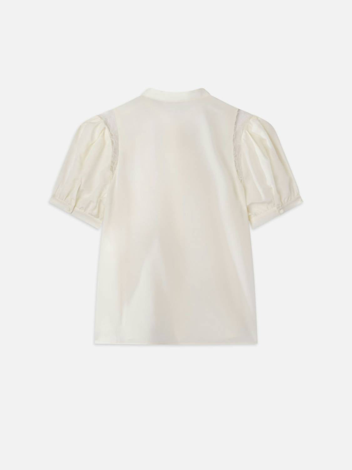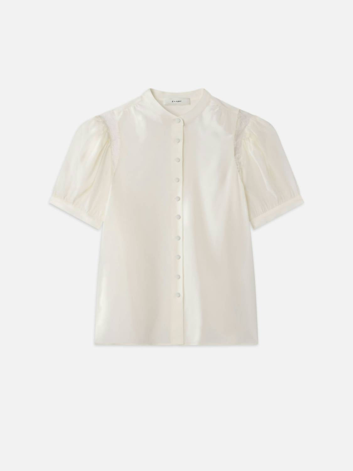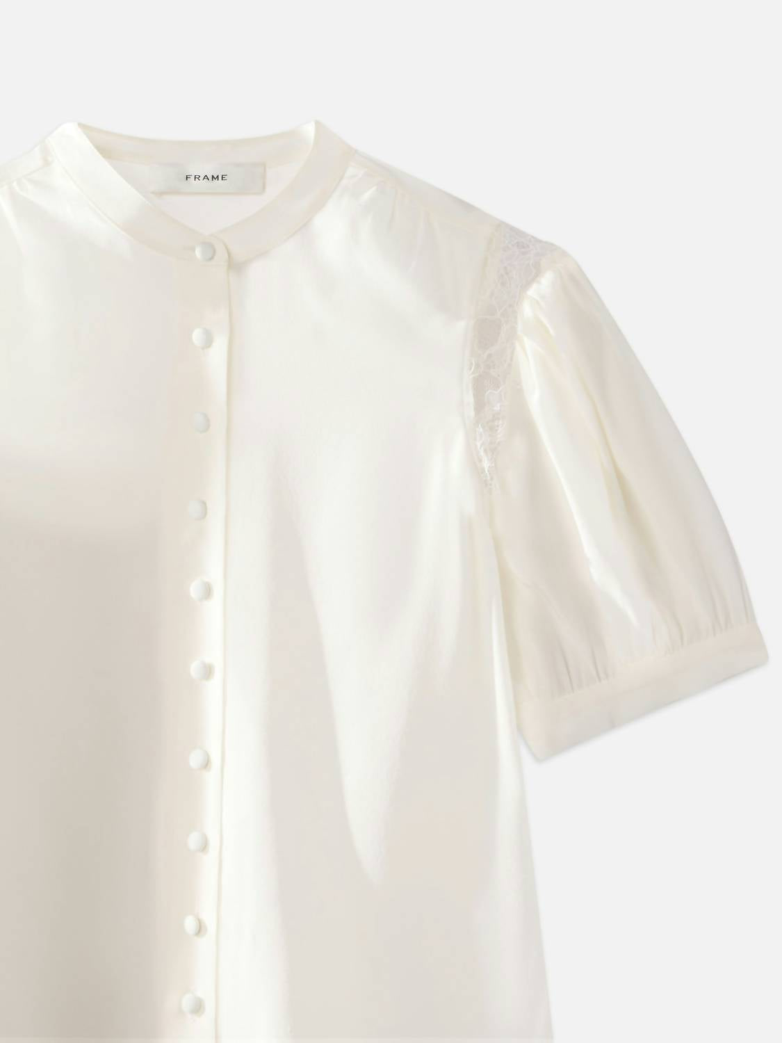 A timeless blouse that will never go out of style. The Lace Shoulder Inset Blouse by FRAME offers a sophisticated touch to any wardrobe with its delicate lace detailing. This short-sleeve blouse is crafted from luxurious silk in a classic cream hue, featuring a stylish mockneck and button closure for added elegance. Perfect for spring, it can be effortlessly paired with tailored trousers for a chic office look or a silk skirt for a romantic ensemble. Care: Dry clean only.