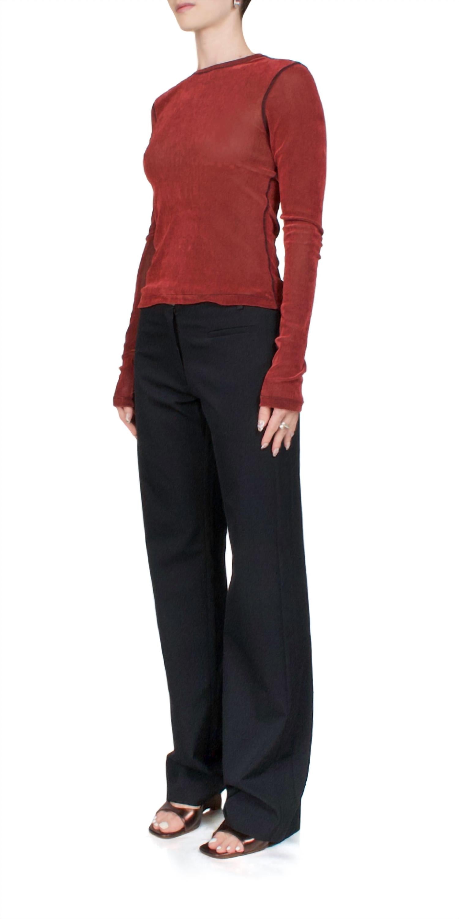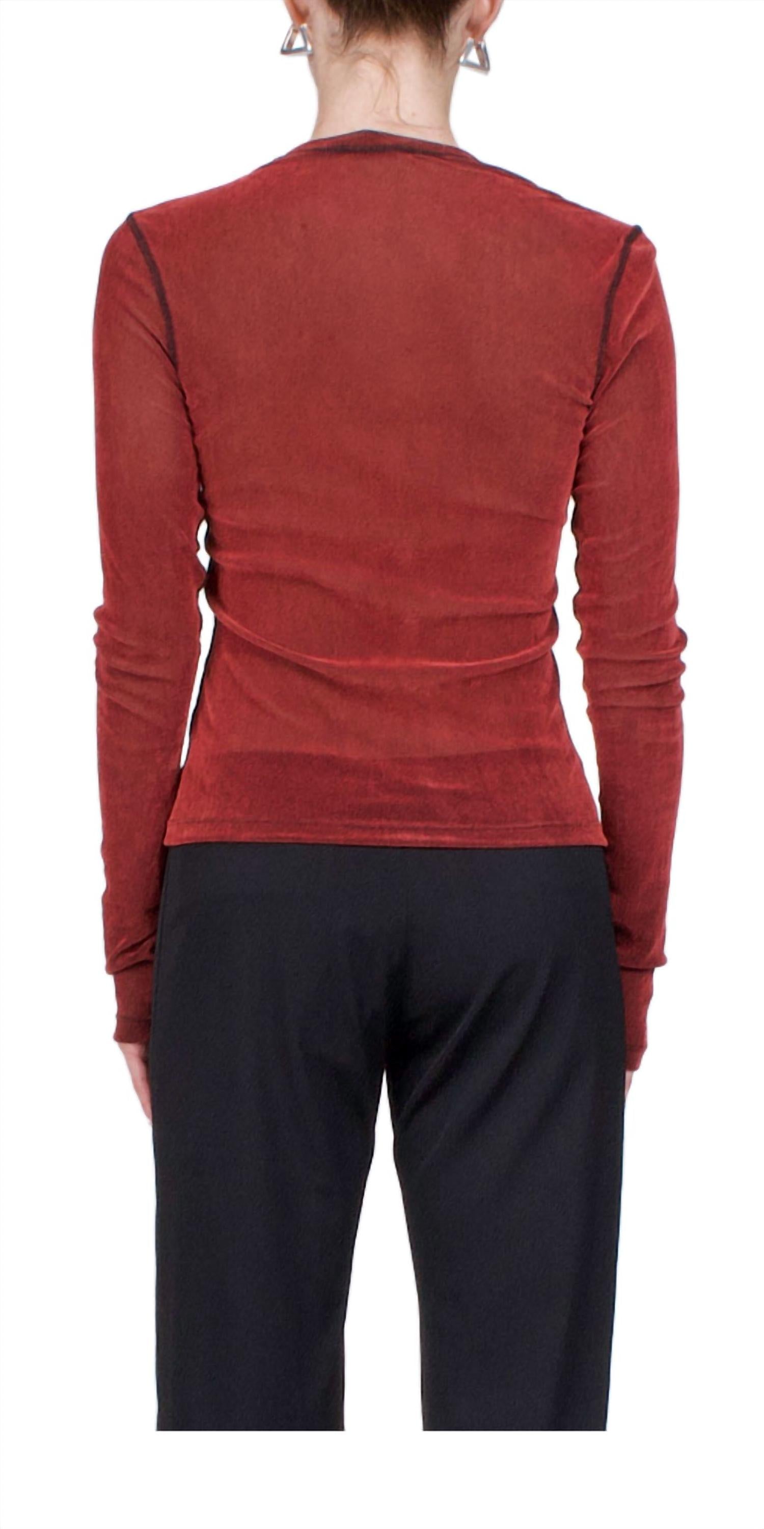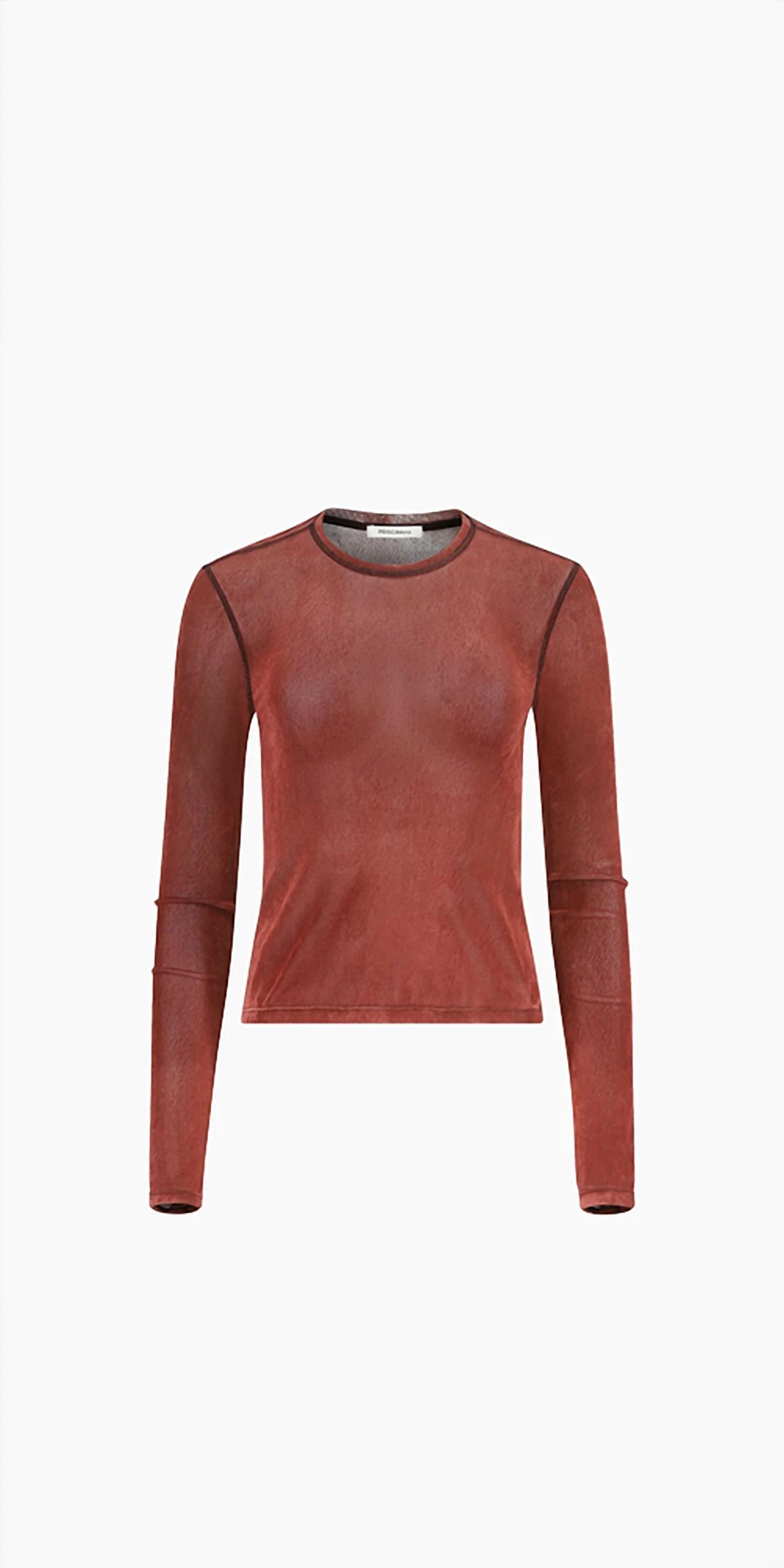 The perfect long sleeve tee that goes with just about anything. Introducing the Velvet Mesh Long Sleeve Top by PRISCAVera, an exquisite piece crafted to fit closely, highlighting the brand's signature elegance. This top in a rich Brick hue features long sleeves and is made of 100% Polyamide, showcasing the shimmering Japanese Velvet Mesh fabric. Originating from NYC, its pull-on closure and versatile crewneck design make it a must-have addition to your wardrobe.