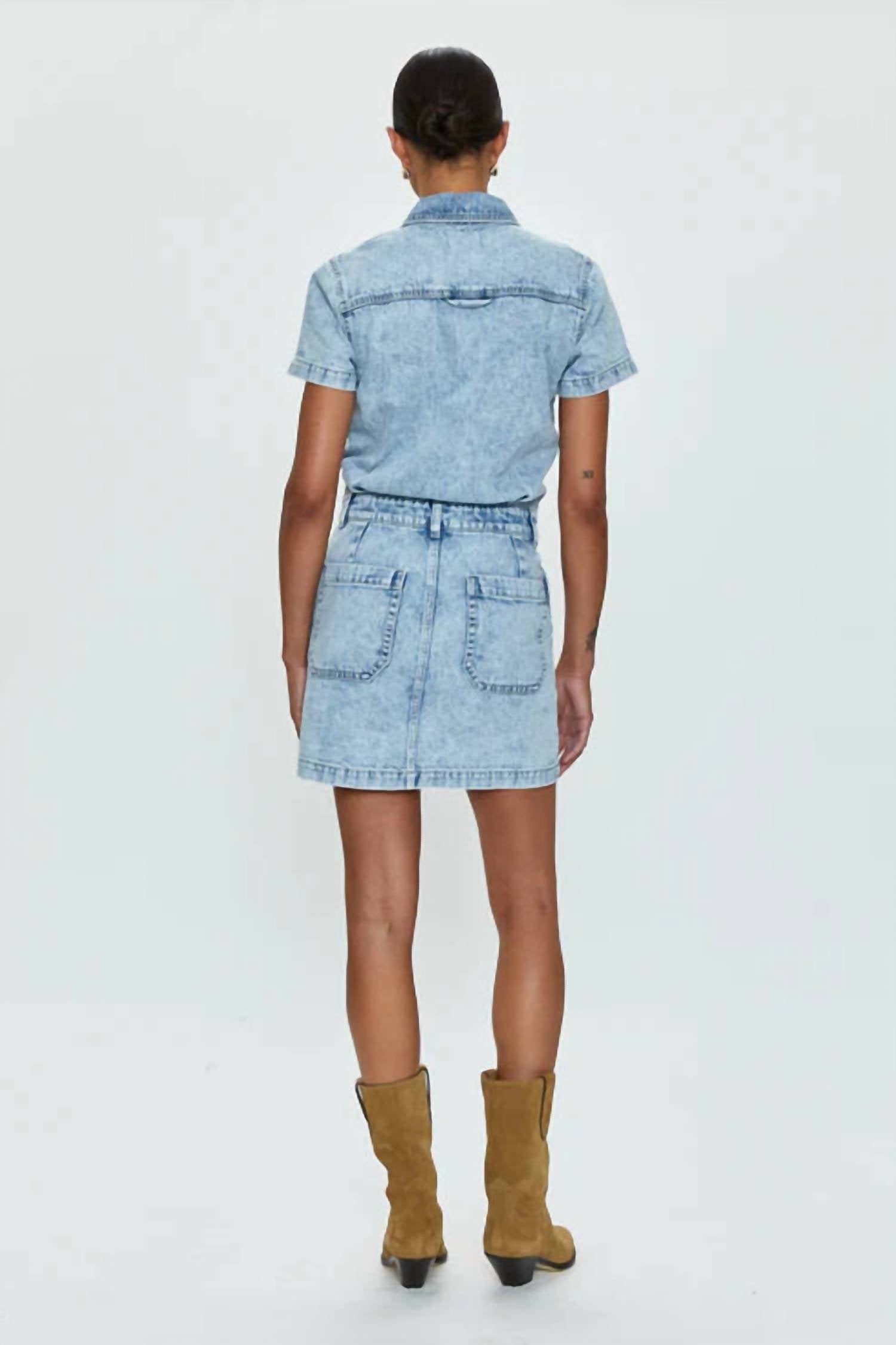 The perfect mini dress for those warmer months. Introducing the Brix Aviator Mini Dress by PISTOLA, perfect for adding a vintage flair to your summer wardrobe. This mini dress, made from 100% rigid non-stretch cotton, showcases a classic collar neckline and short sleeves in a solid medium blue denim wash with blasted fading. It features a practical zip-up closure and patch front pockets for added style and convenience. The dress is 34 1/2" in length, imported, and easy to maintain with a cold wash. Model is 5'10" wearing a size small.