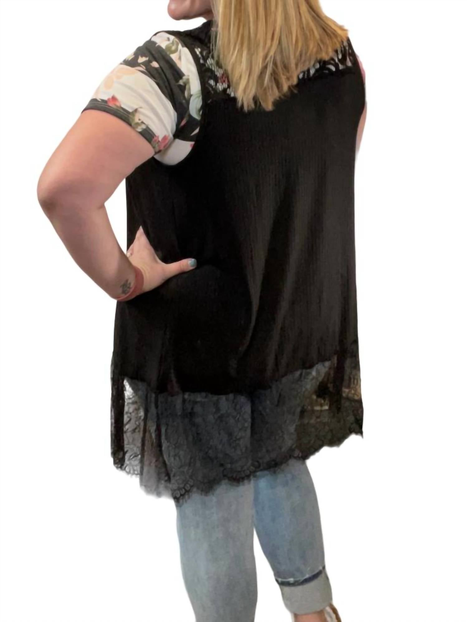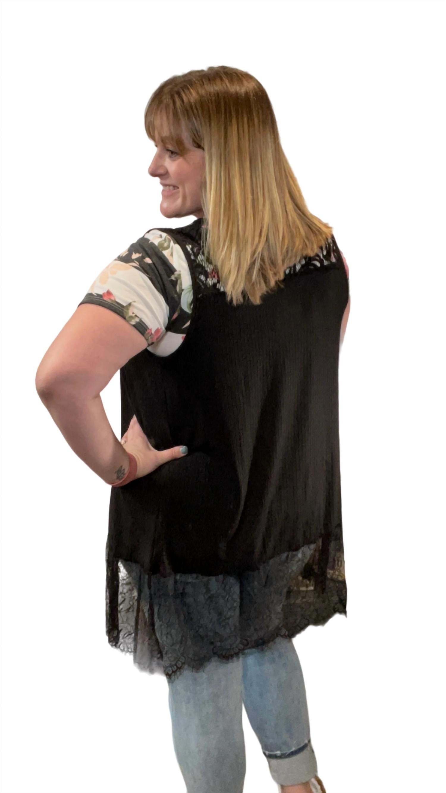 Sleeveless cardigan features a lace detail and textured pattern. Sizes S 0-4, M 6-8, L 10-12, 1X 14-18, 2X 20-22, and 3X 24-26.