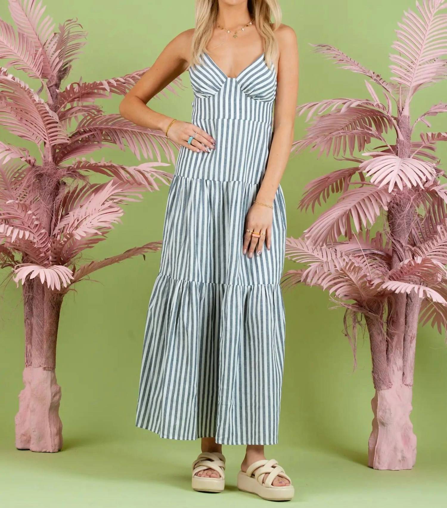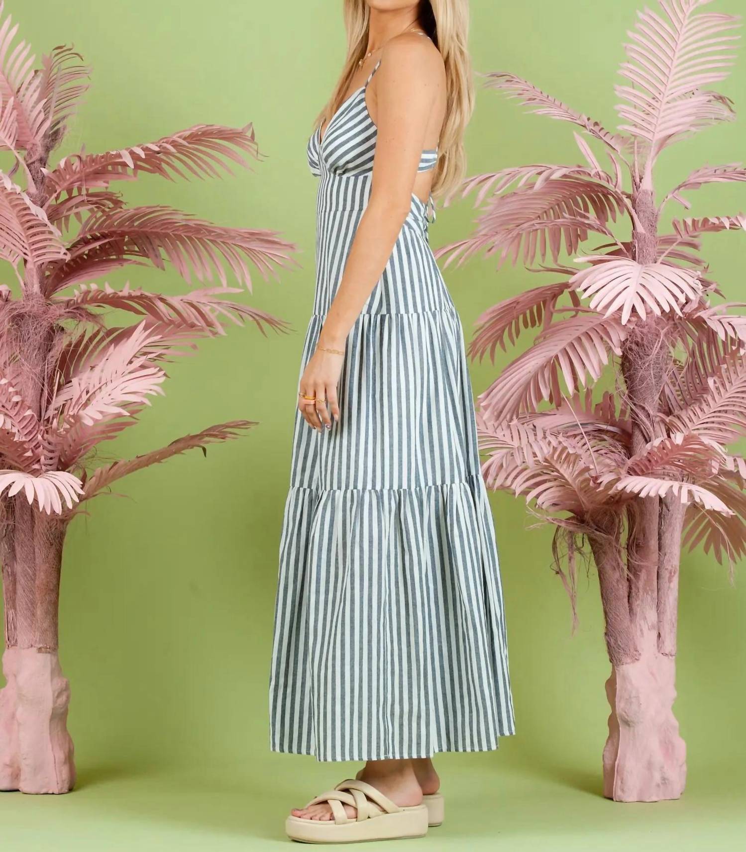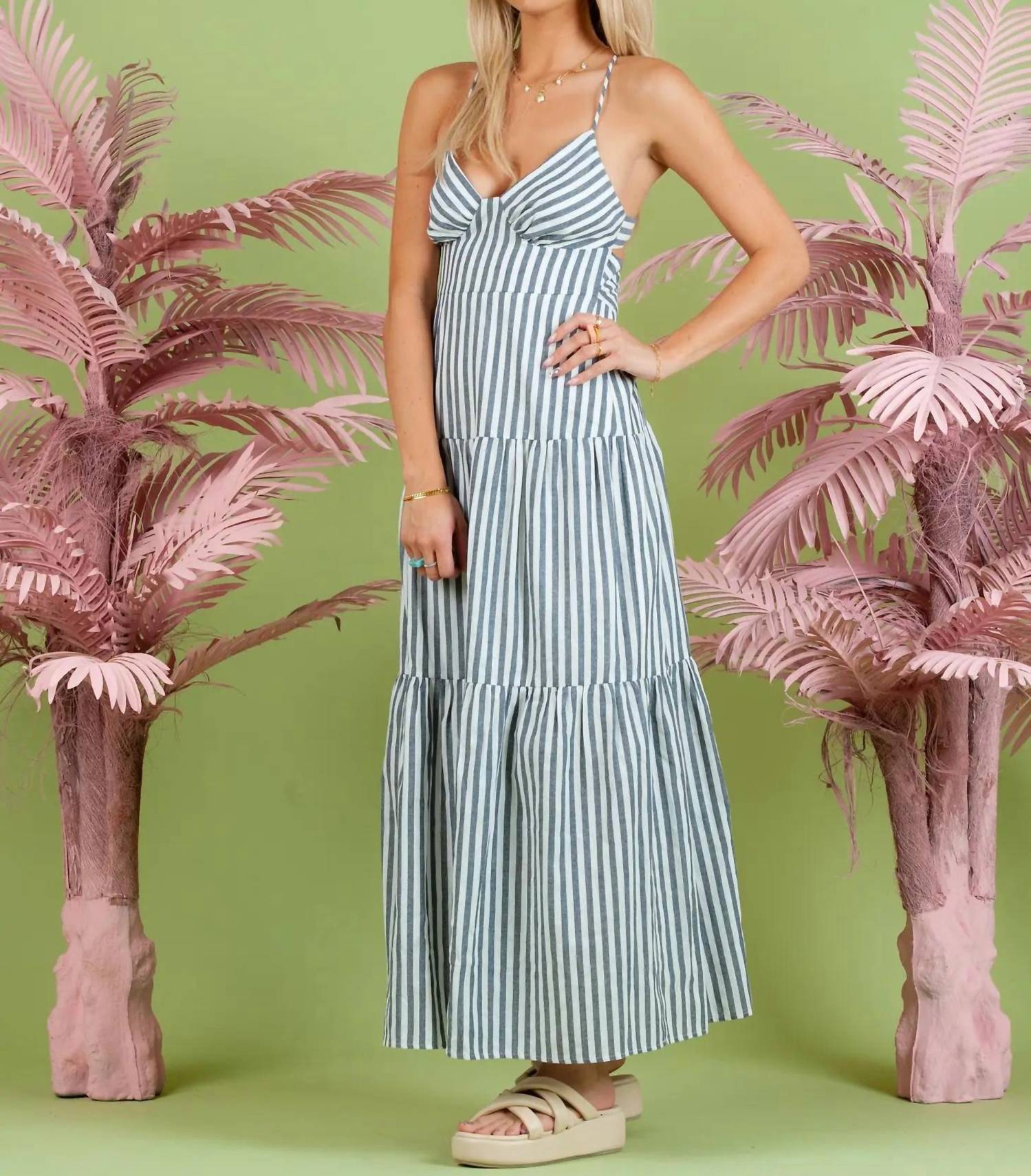 Who doesn't love a good maxi dress? This one you'll be reaching for season after season. Introducing the Lilah Striped Dress by LUCCA, a stunning addition to your summer wardrobe in elegant navy with a chic stripe pattern. This sleeveless maxi dress features an A-line silhouette and a flattering V-neck, perfect for vacation or Easter celebrations. Designed with adjustable straps, an open back, and delicate tiered detail, it offers both style and comfort. Closure: Tie Closure. Ideal for layering, this dress runs true to size and makes an effortless statement for any warm weather occasion.