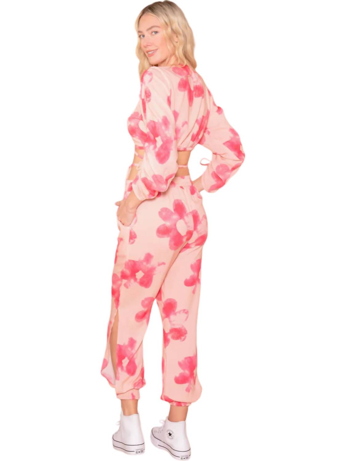 Enchanting crop top features a charming wrap style. Effortlessly accentuates your silhouette. V-neckline adds a touch of elegance. Long sleeves with ruching and cinched tie bring a playful, yet refined detail. Draped in a beautiful pink floral pattern. Radiates femininity and flair. Graceful design and eye-catching features.