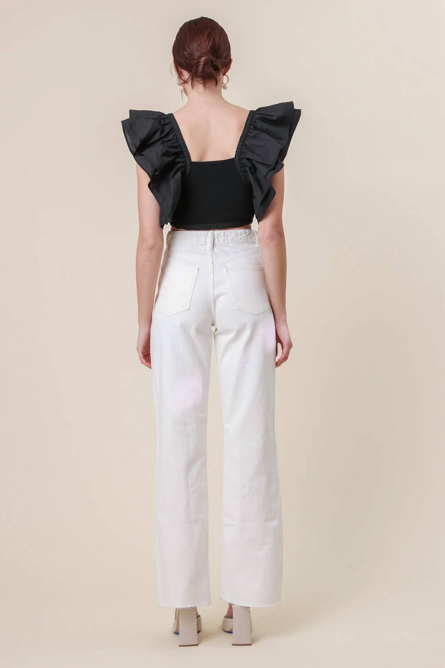 Pair this crop top with your favorite high-waisted jeans or maxi skirt. Introducing the Mara Crop Top by Line & Dot, a chic addition to your spring wardrobe. This solid black top features short flutter sleeves and a flattering square neckline, perfect for vacation or Easter gatherings. Crafted from a comfortable blend of 59% rayon, 38% nylon, and 3% spandex, it offers a soft stretch-knit bodice. Closure: Pull-on. Care: Dry clean only.