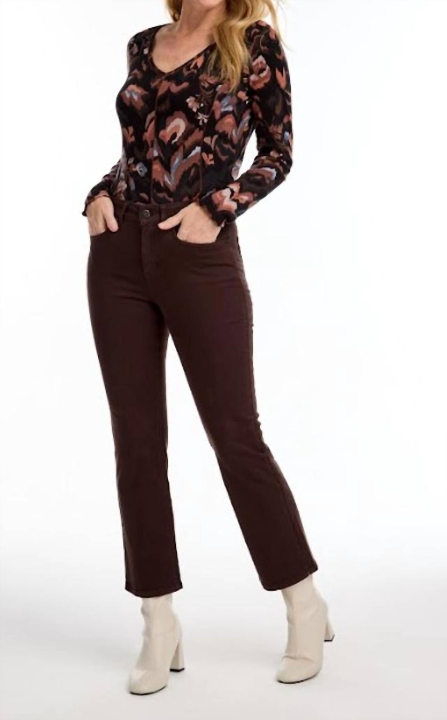 Upgrade your wardrobe with these cropped pants, designed to merge sophistication and wearability. The tailored fit ensures ultimate comfort during long days or nights out. Experience effortless style and comfort with the Olivia Boot Ankle Pant by FDJ, crafted from a premium cotton blend in a rich brown shade. This solid high-rise pant features a flattering bootcut leg and a practical five-pocket design. Made with 89% cotton, 10% polyester, and 1% elastane, it provides a perfect blend of durability and stretch. Closure: Button and zipper closure. Care: Machine wash cold inside out, use non-chlorine bleach if needed, and line dry.