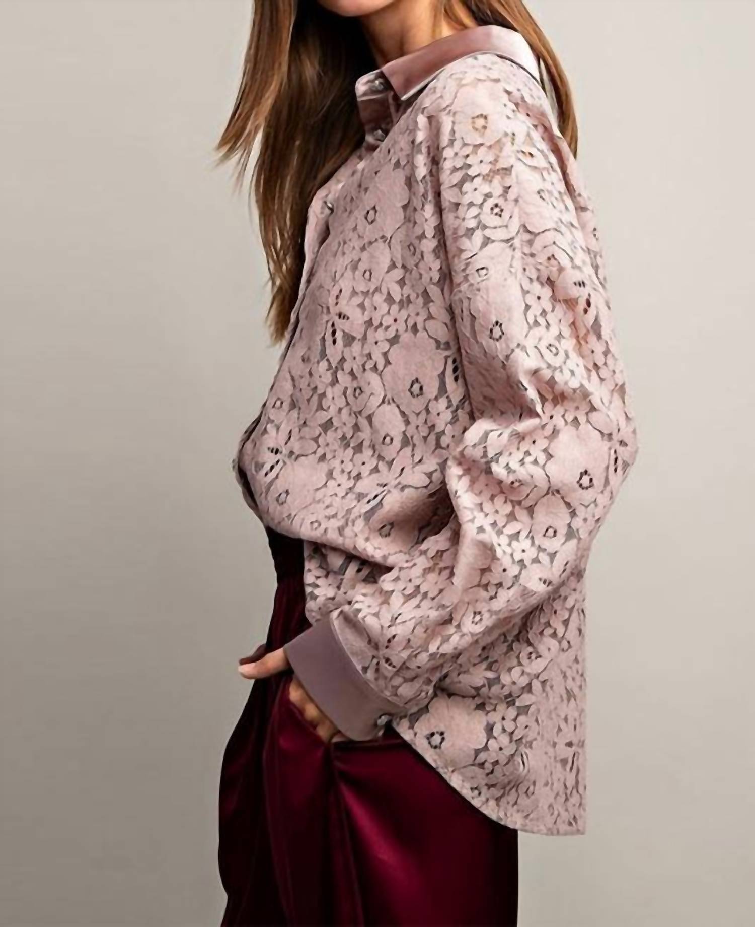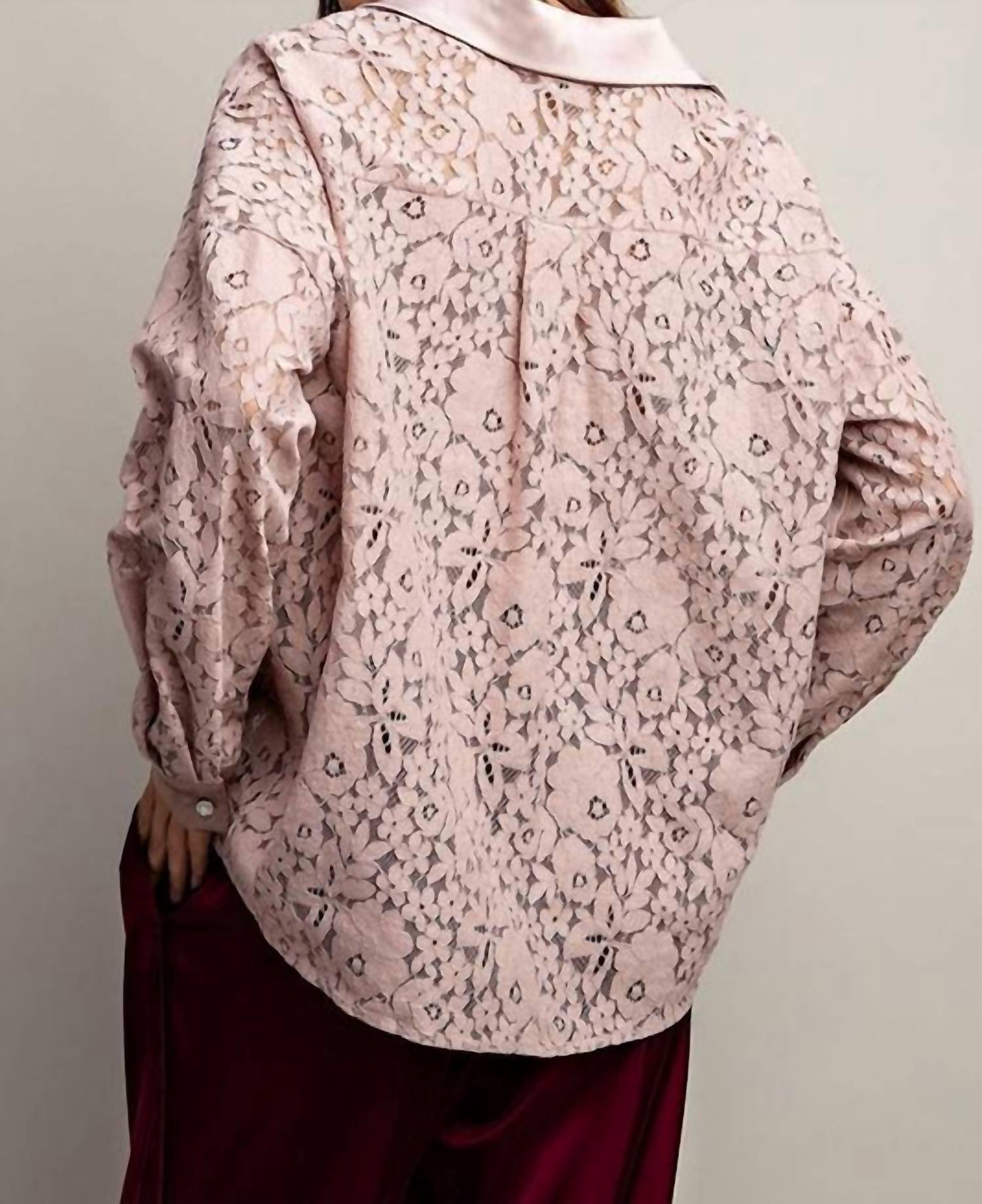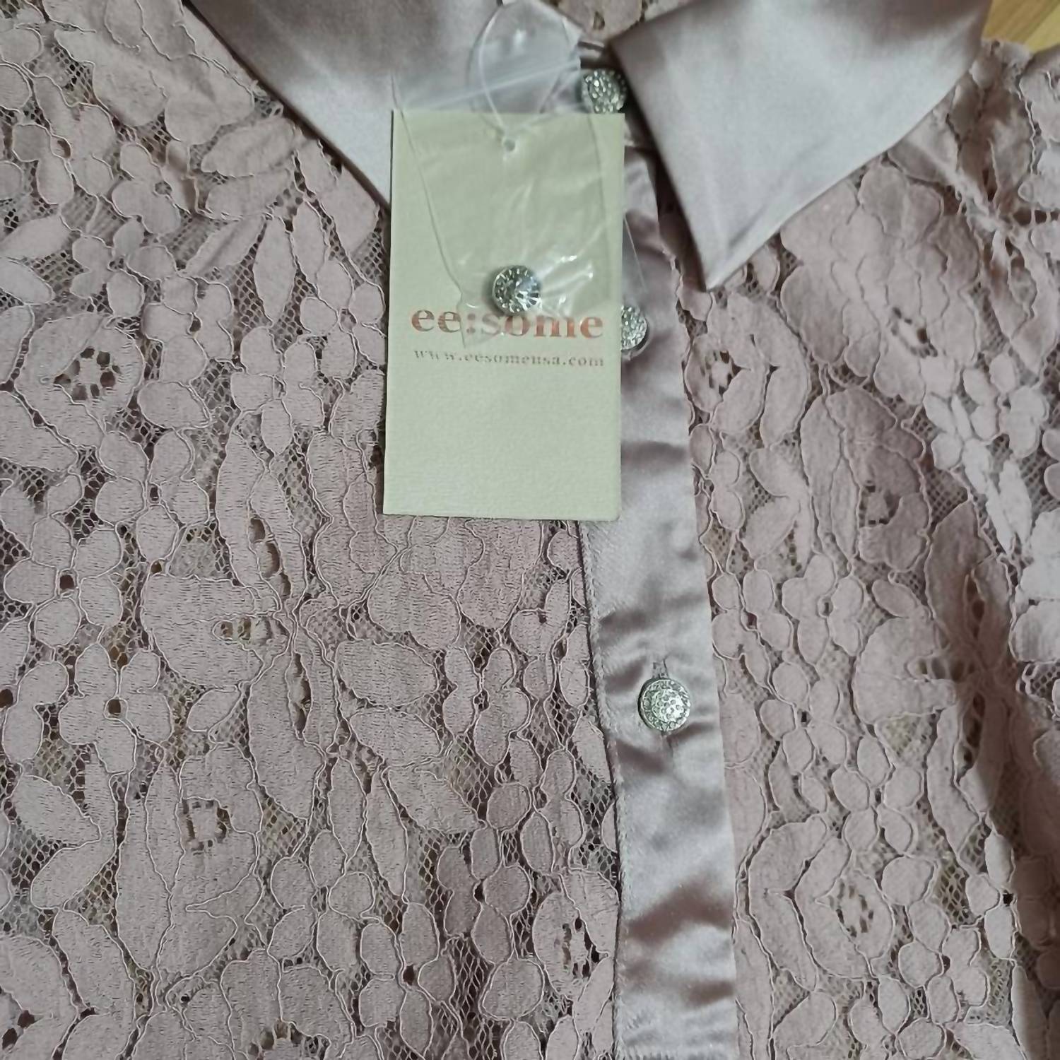 Pair this with your favorite jeans and slides for your next girls night out. Discover the ee:some Floral Lace Tuxedo Blouse, an exquisite blend of romantic vintage style and modern elegance. With long sleeves and crafted from 70% cotton and 30% nylon, this blouse features a chic collared neckline and rhinestone button closure. The sheer lace and satin finish collar sleeve accents add sophisticated charm, while its oversized loose fit flatters the silhouette. Bust measurements range from 42-46 inches, and length varies between 24-25 inches.