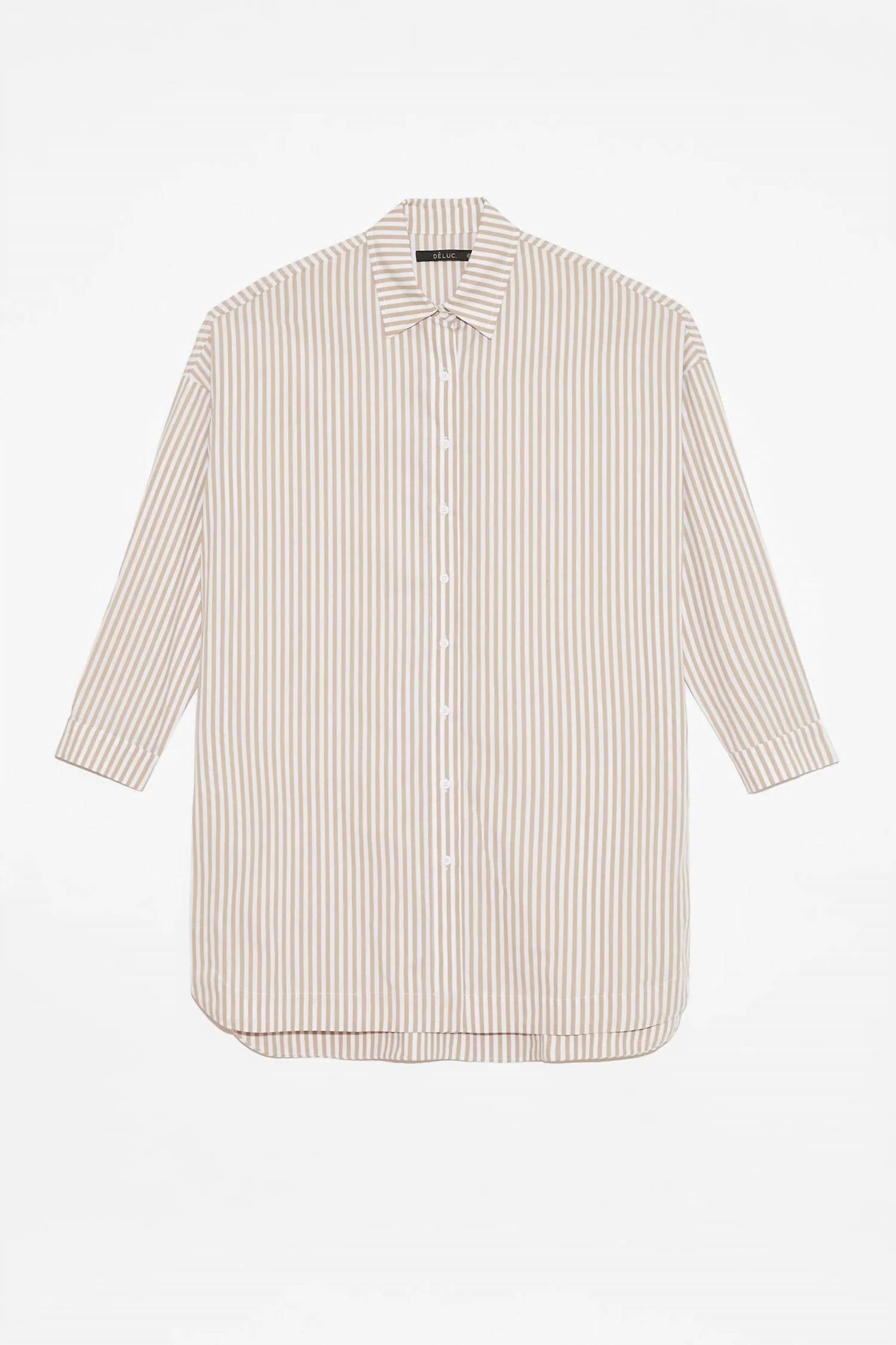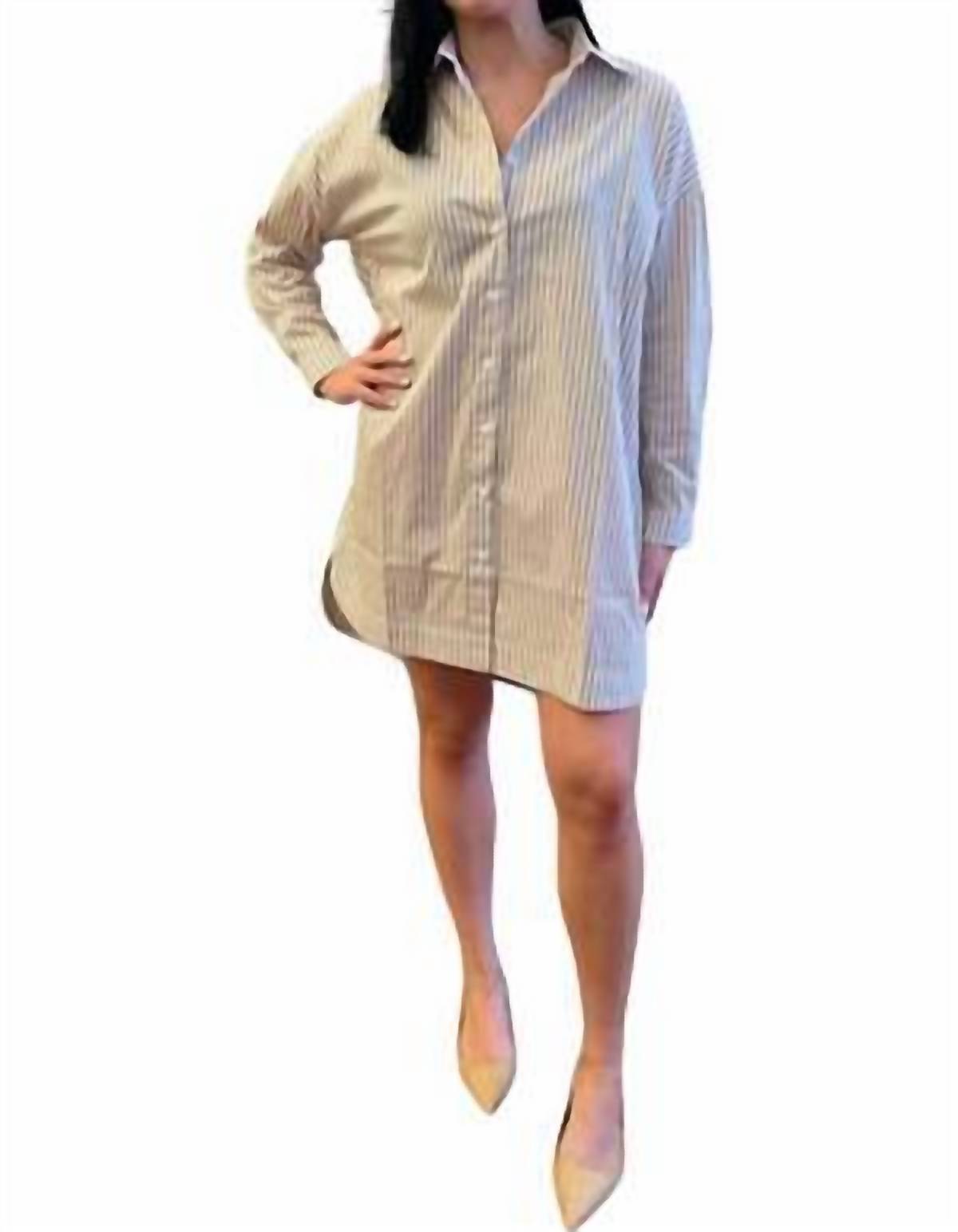 Shirt dress that brings an edgy yet classic touch. Crafted from 100% cotton. Boasts a chic stripe pattern in a versatile tan hue. Featuring a button closure and collar neckline. Perfectly encapsulates effortless style. Designed for women who appreciate both comfort and fashion. Offers an oversized fit, yet stays true to size. Recommendation to size down for a more fitted look. Machine washable.