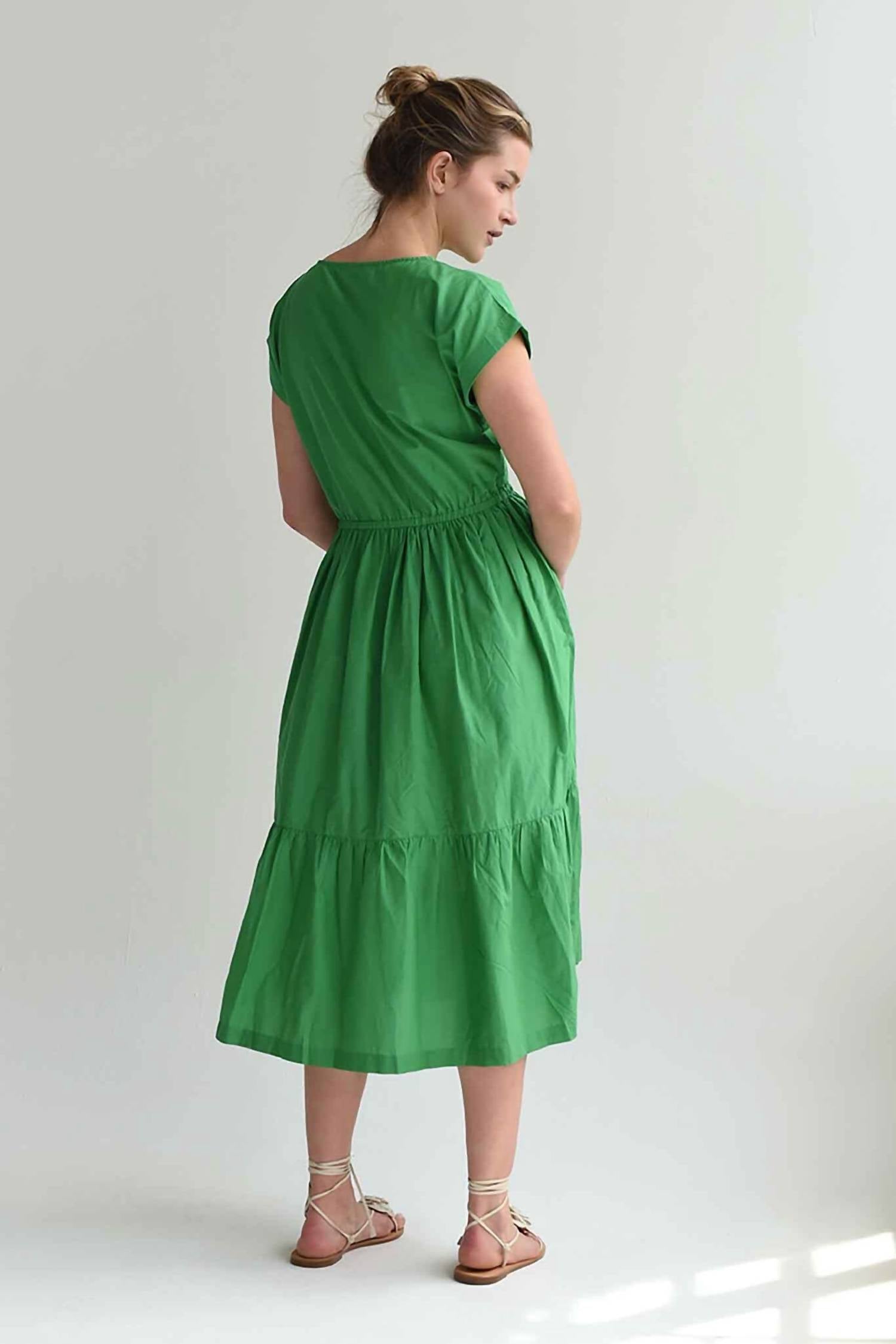 Just add slides or mules and you are good to go. Elevate your wardrobe with the M.PATMOS Penelope Midi Dress in Kelly Green, a minimalist A-line silhouette perfect for any special occasion. This dress features short sleeves and a crew neckline, crafted from a luxurious cotton-silk blend that falls to a mid-calf length. It includes an elastic waist and side seam pockets for added convenience and style, with a pull-on closure ensuring effortless wear. Made with care in India, this piece should be machine washed and line dried to preserve its elegant design.