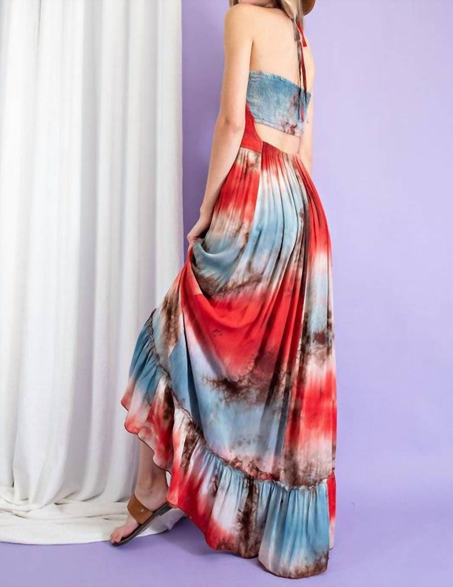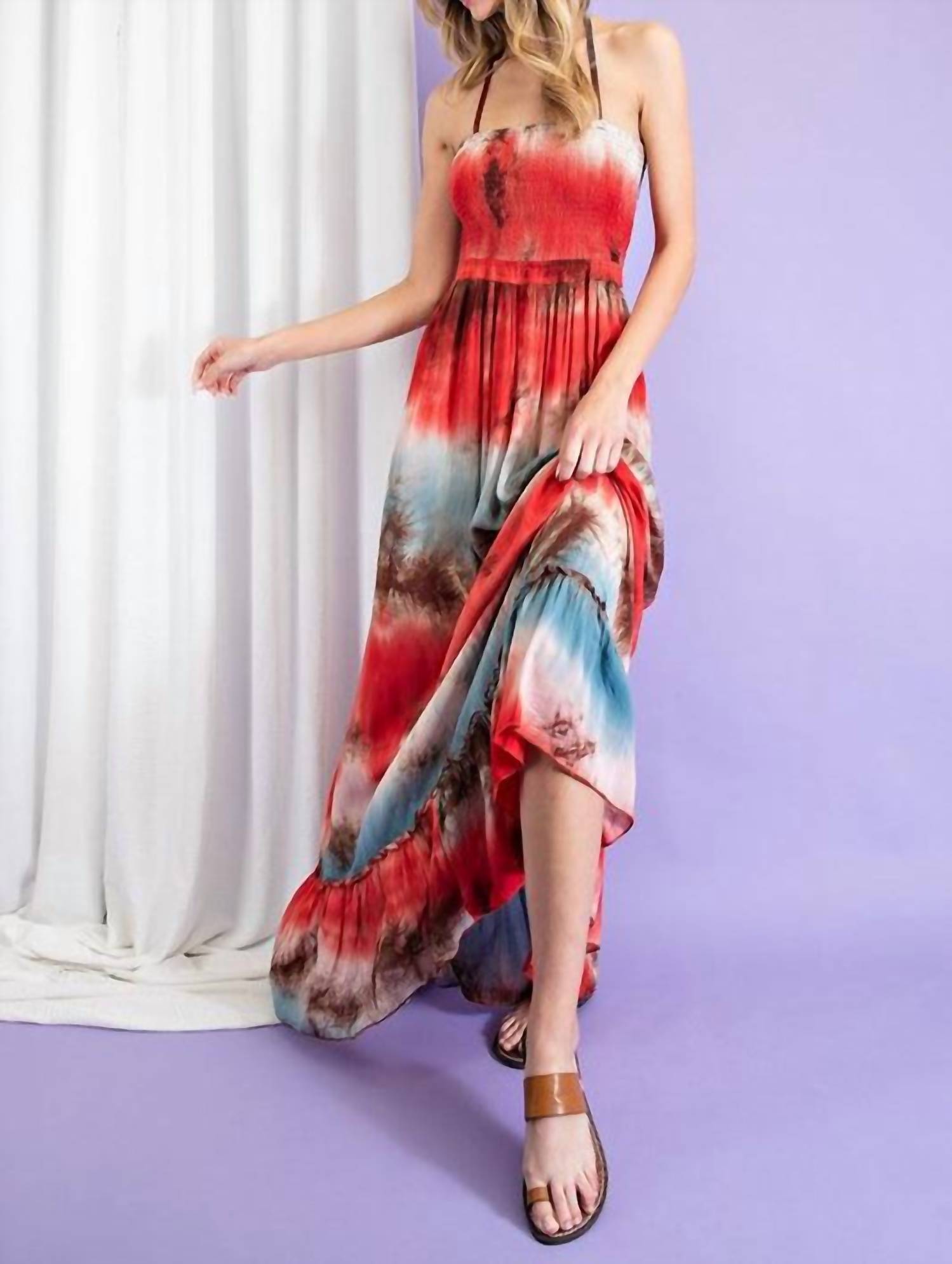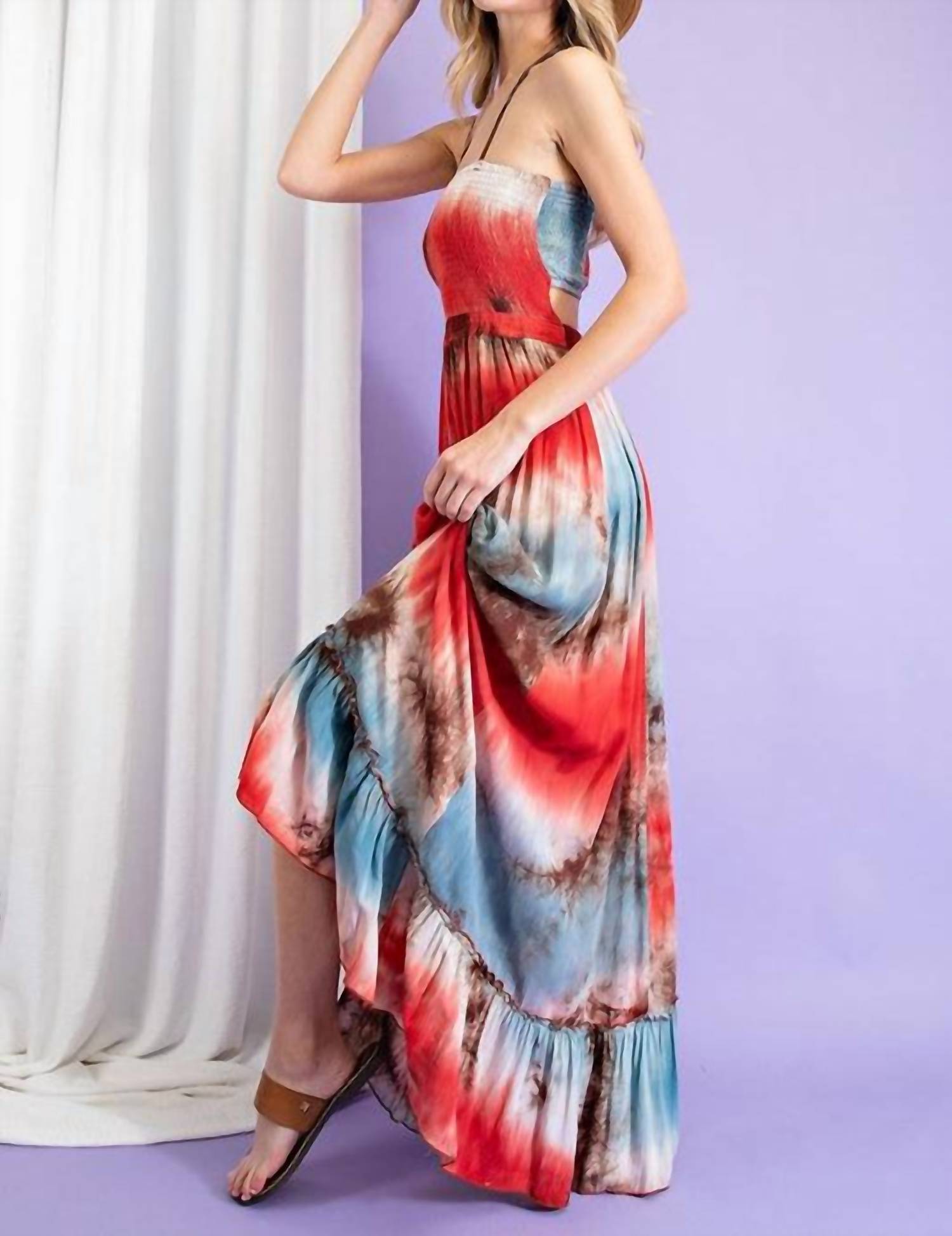 A maxi dress that is just as cute as it is comfortable. Elevate your beach wardrobe with the Tie Dye Halter Maxi Dress by ee:some, a vibrant choice in scarlet sure to turn heads. Designed with delicate spaghetti straps and an empire waist, this dress features a playful tie-dye pattern enhanced by its flowy silhouette. Crafted with an off-the-shoulder neckline, it offers a tie closure for easy wearing. Care: Hand wash and line dry for best results.