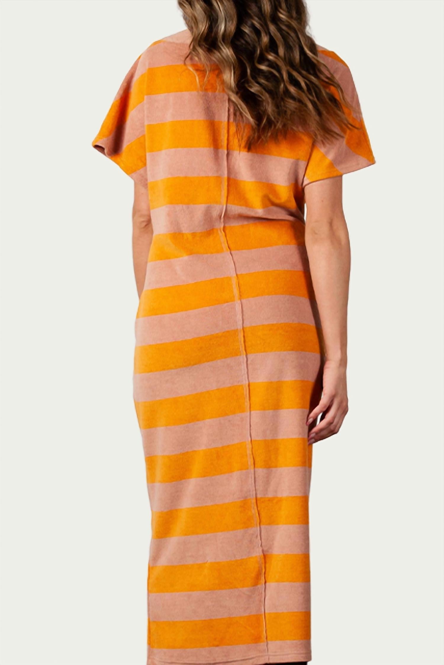 Lucca Couture's maxi dress is perfect for slipping on over your swimsuit after taking a dip. Made of cotton-blend terry, it has a relaxed shape and front patch pockets. Pack yours for your next beach getaway.Color: Orange Taupe StripeFabrication: 80% Cotton, 20% PolyesterCare: Hand wash cold, lay flat to dryStandard Clothing Sizing