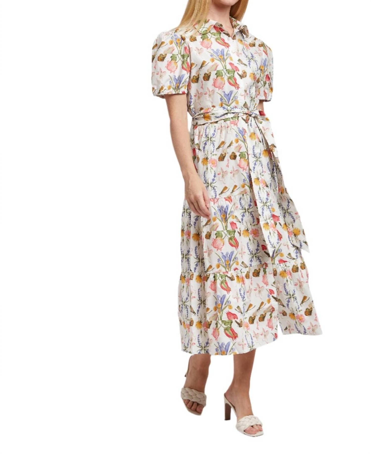 The perfect length dress does exist. Introducing the Chloe Dress by Taylor Tillman, a stunning piece in Garden Symphony floral print. This women's shirt dress features short sleeves and a collar neckline, crafted from a premium cotton blend for comfort and style. Its button closure and waist tie enhance its tailored silhouette while the tiered skirt adds an elegant touch. Care for this timeless statement dress is a breeze with machine wash and tumble dry instructions. 97% Cotton/3% Spandex.