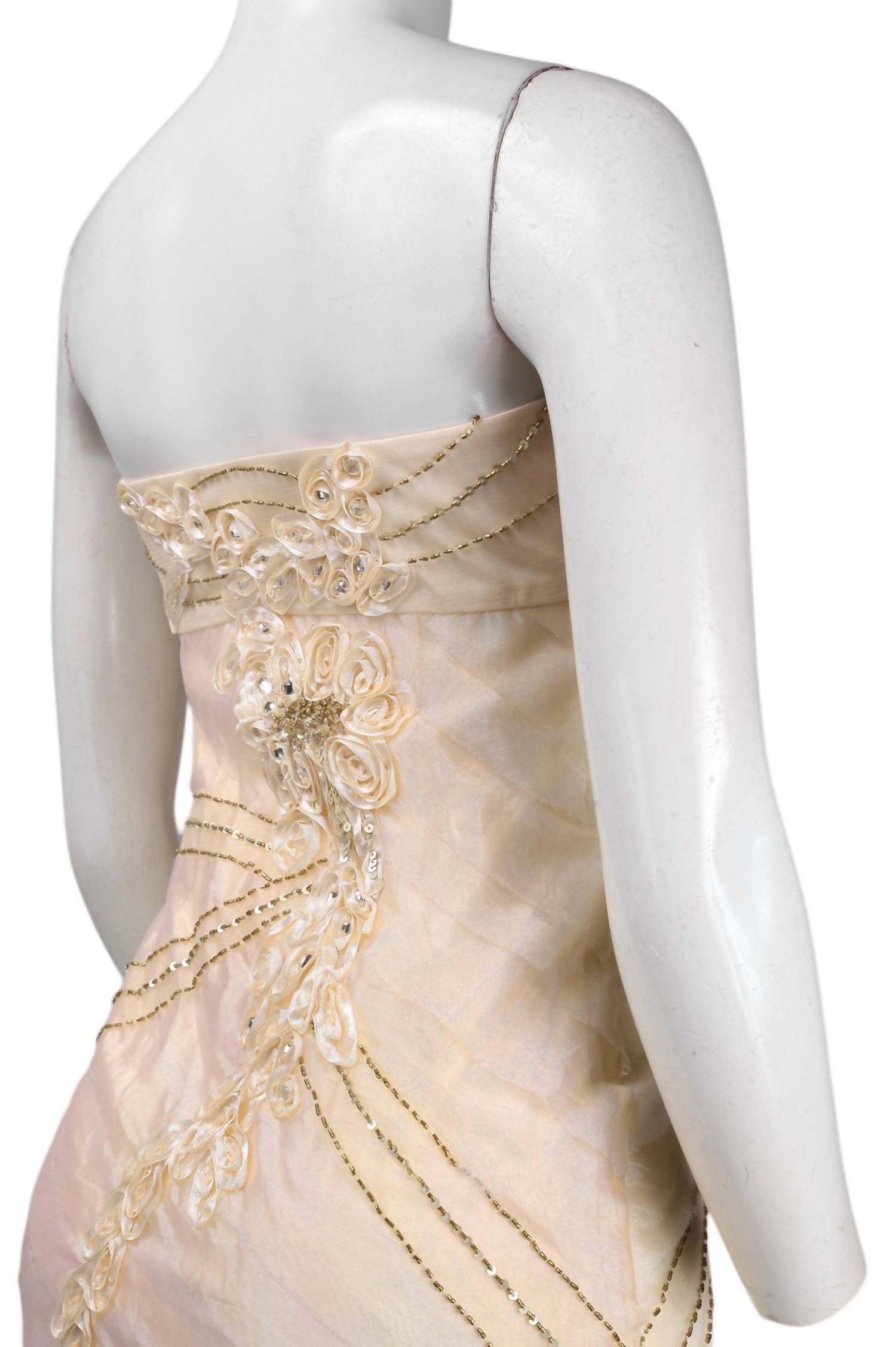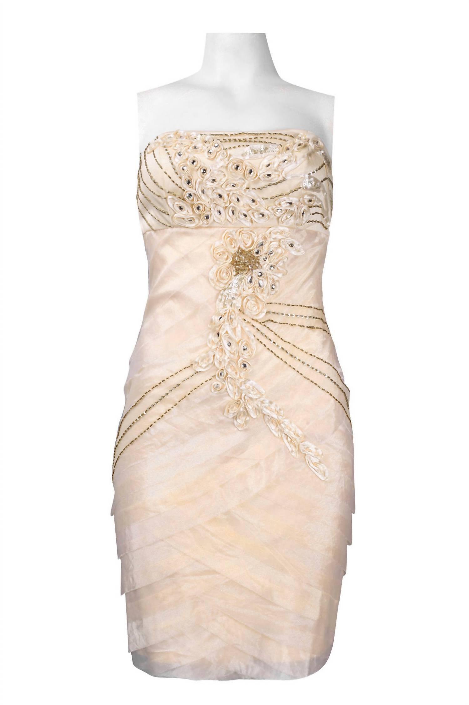 The perfect mini dress for those warmer months. The Sue Wong Strapless Ribbon Applique Beaded Dress is a show-stopping piece for special occasions. This champagne mini dress features a strapless, off-the-shoulder bodycon silhouette with a knee-length skirt. Made from 100% polyester organza with a fully lined interior, it is adorned with sequined, beaded stripes and circular ribbon appliques with rhinestone accents. Designed for comfort, it includes a padded bustline and side zipper closure. Spot clean only.