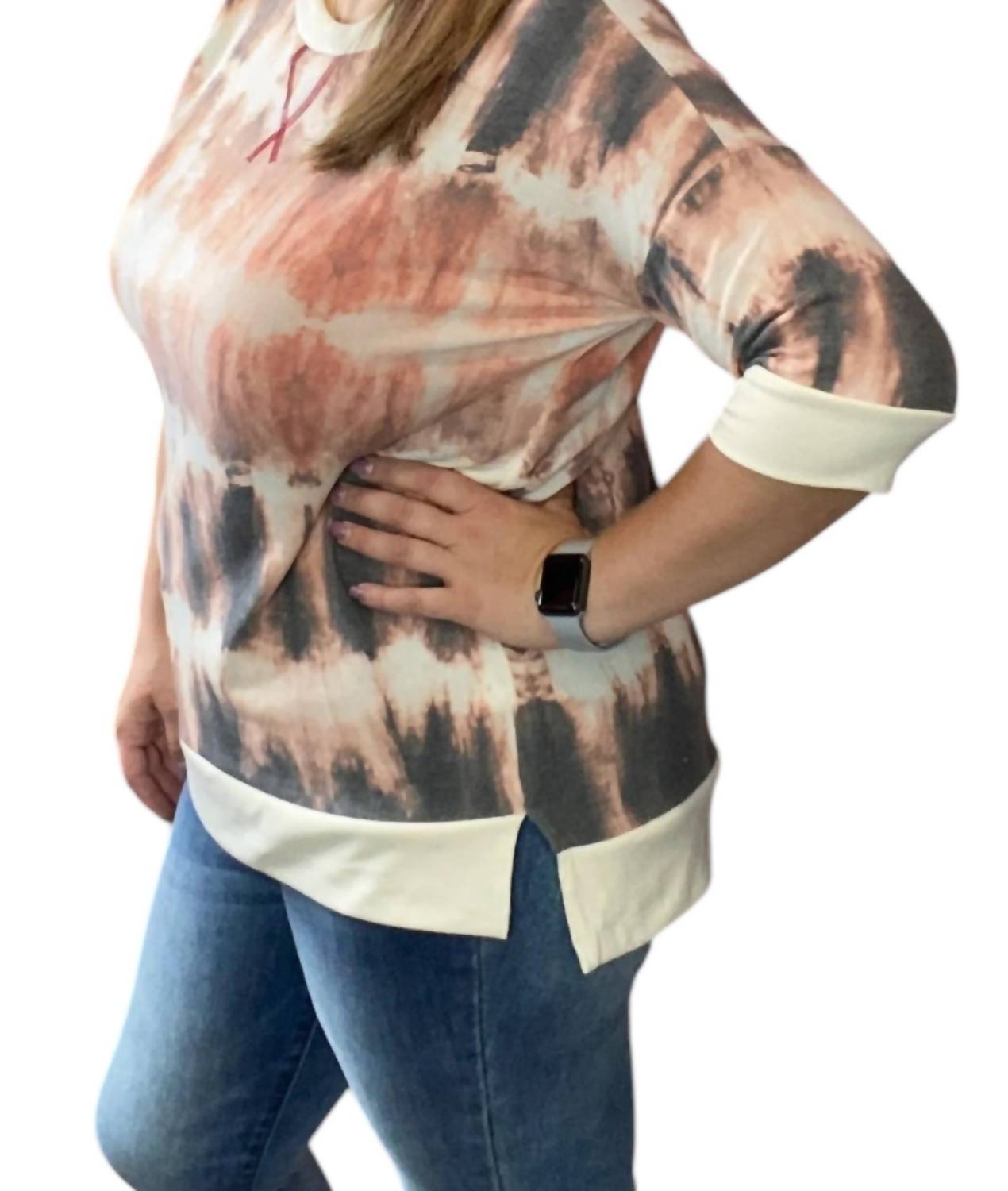 Three quarter sleeves. Tie dye. Scoop neckline. Pullover style. 63% Polyester 34% Rayon 3% Spandex. Machine wash cold.