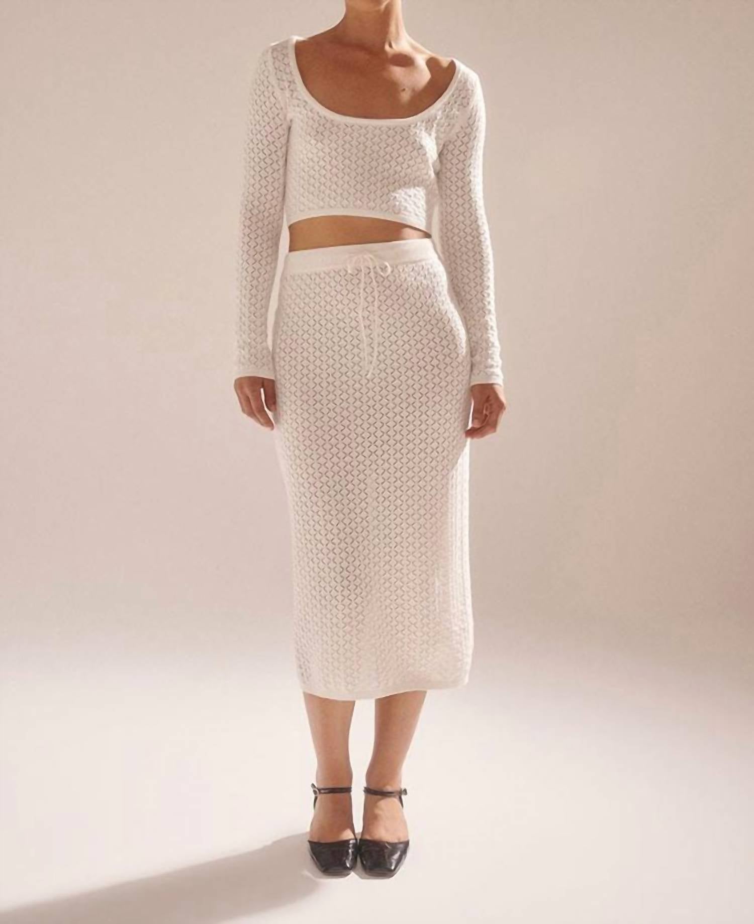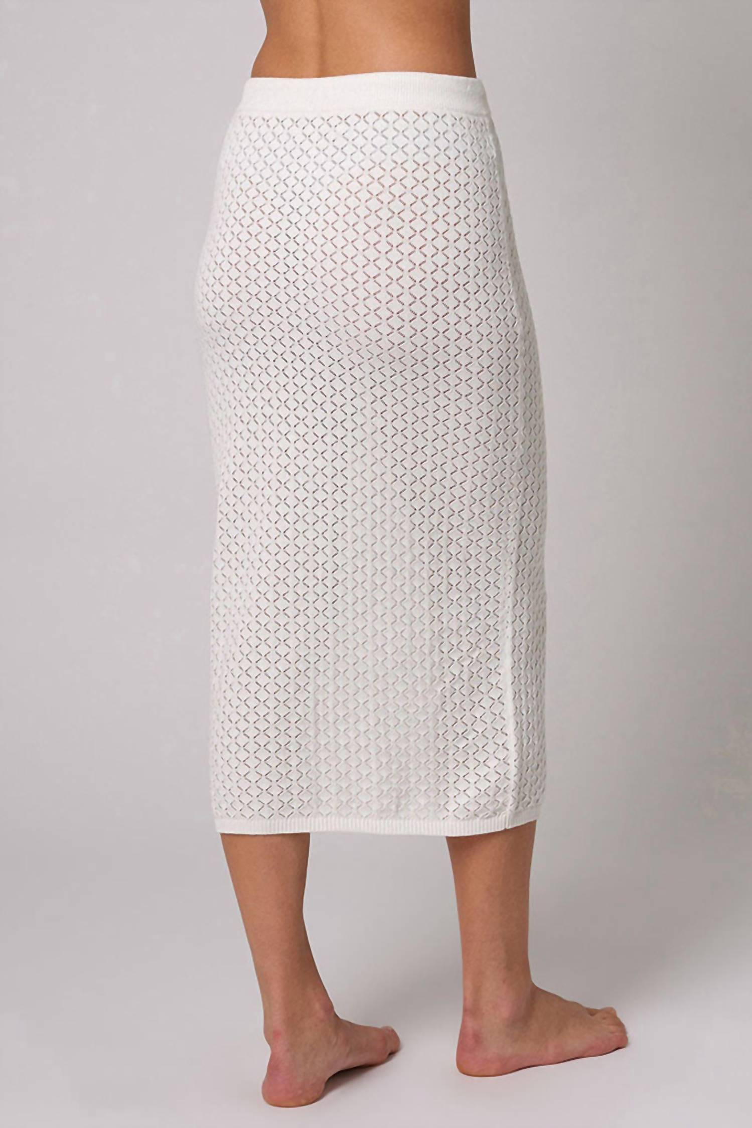 The midi length skirt is here to stay and we especially love this style. Introducing the Diamond Knit Slip Midi Skirt by ROLLA'S, a versatile piece perfect for any spring occasion. This slim-fitting white skirt features a geometric pattern and a cotton diamond knit construction, offering both comfort and style. It has a midi length and can be worn on the waist or hips, with an elastic waistband and drawstring for a customizable fit. Made with 100% cotton. Closure: Pull on. Care: Hand wash and lay flat to dry.