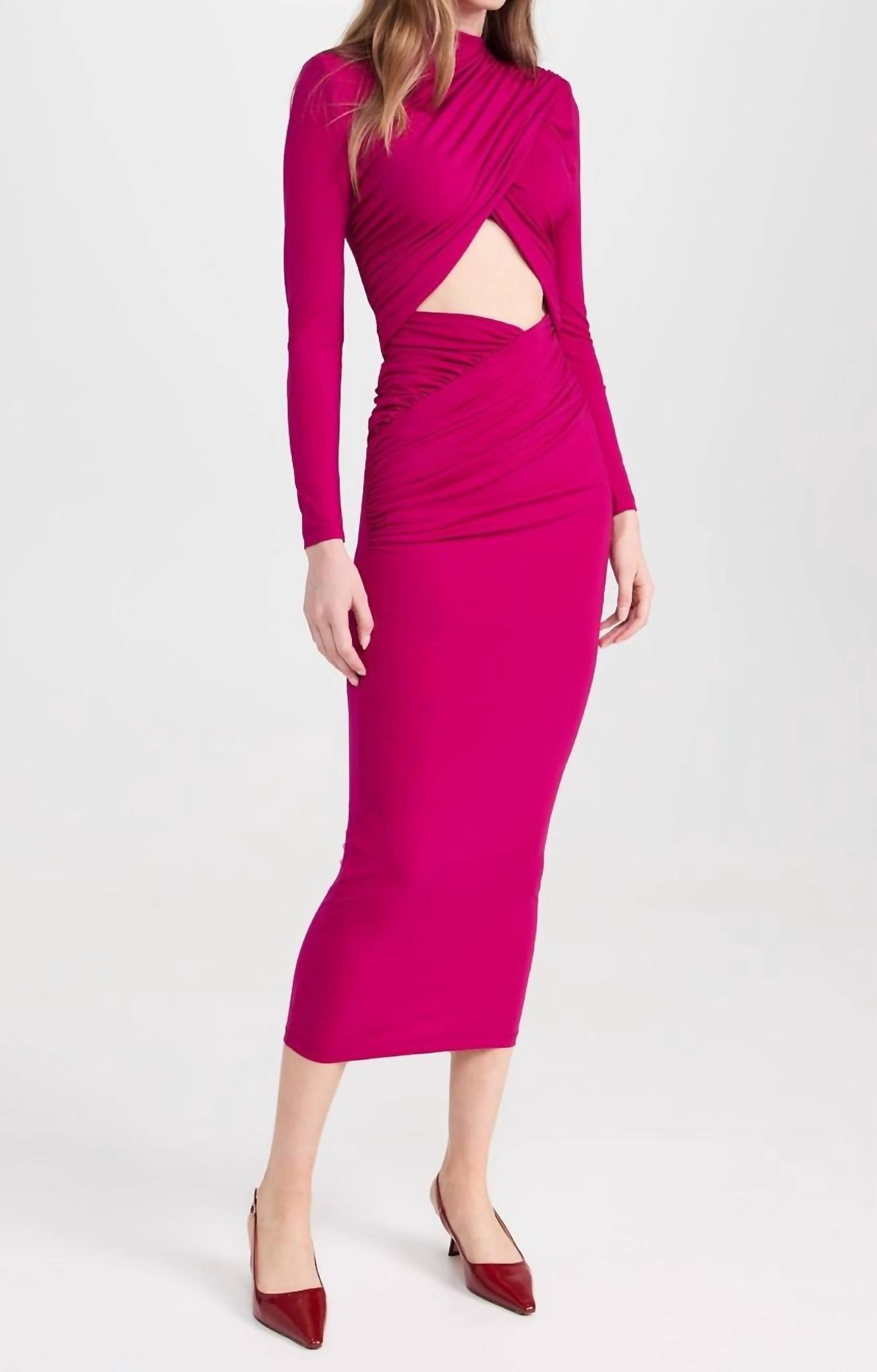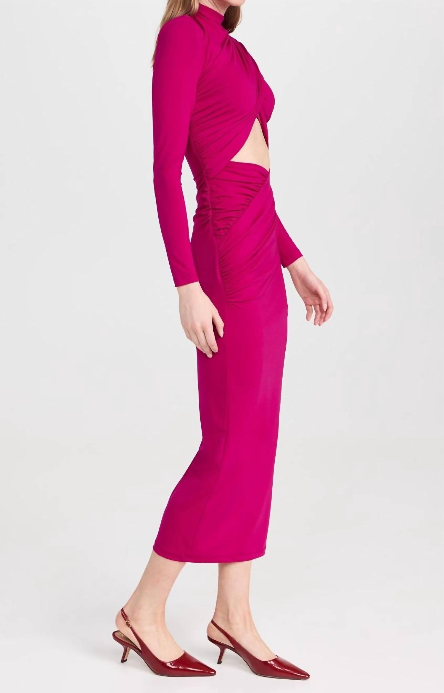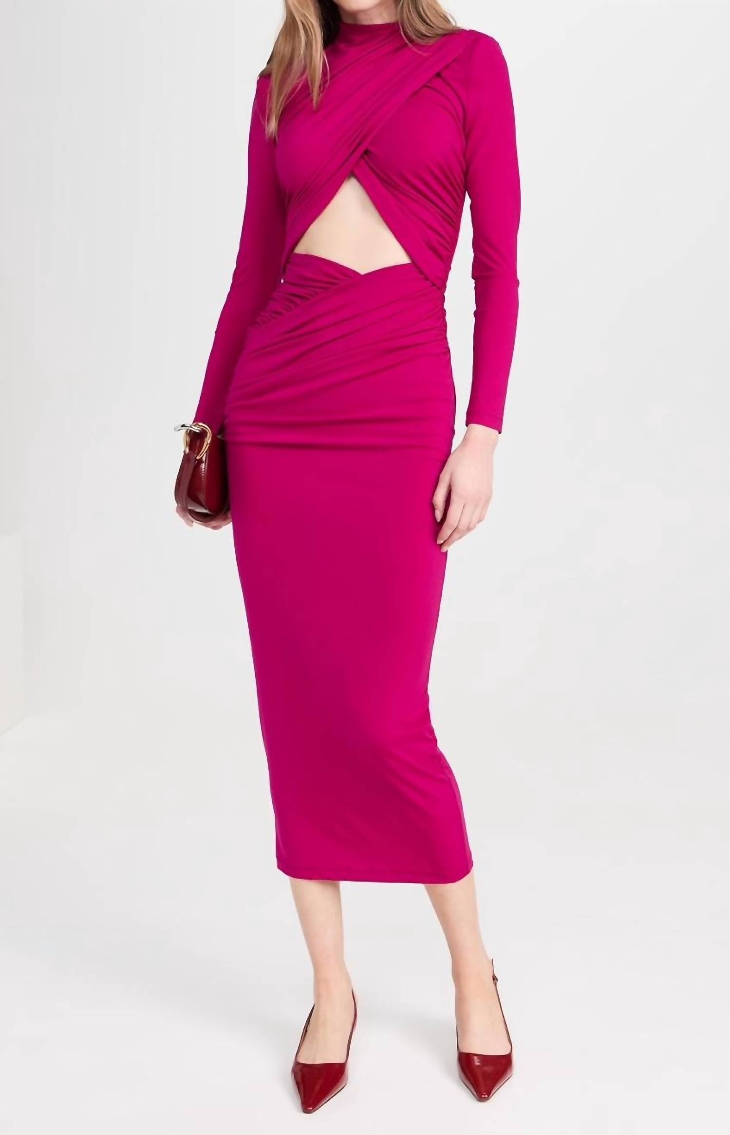 Cute and comfortable, this long sleeve dress has it all. Introducing the Emmeline Jersey Midi Dress by MISHA, an elegant choice for any occasion with its vibrant raspberry hue and 54-inch sheath silhouette. This piece features long sleeves and a high neckline designed with a chic wrap silhouette and front cutout detail, perfect for adding a modern twist. Crafted from 95% polyester and 5% elastane, this lightweight, super-stretch jersey dress is constructed in China, offering a tailored fit with a zip closure. Easy to maintain with a dry clean, it's a timeless addition to your wardrobe. Model is 5'6" and wearing size XS; runs true to size.