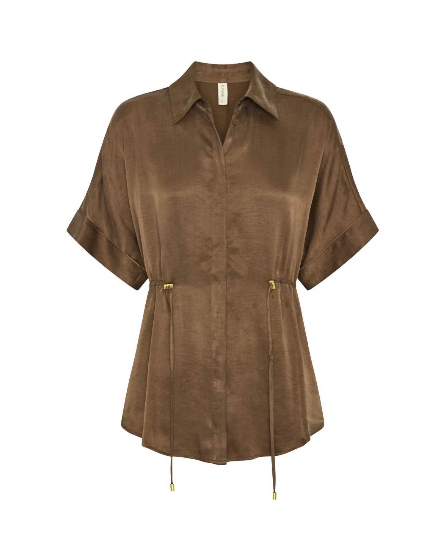 This classic, short sleeve tee will be your go-to staple this season and beyond. The Kivari Jaxon Shirt in mocha is a sophisticated piece designed for a refined yet comfortable look. Featuring short sleeves and a concealed button closure, this shirt highlights a minimalist and tailored silhouette with an adjustable drawcord at the waist. Made from 60% lyocell and 40% viscose, it promises both softness and durability. Care: Dry clean only. Perfect for a holiday party or a coordinated look when paired with the matching Jaxon Pant.