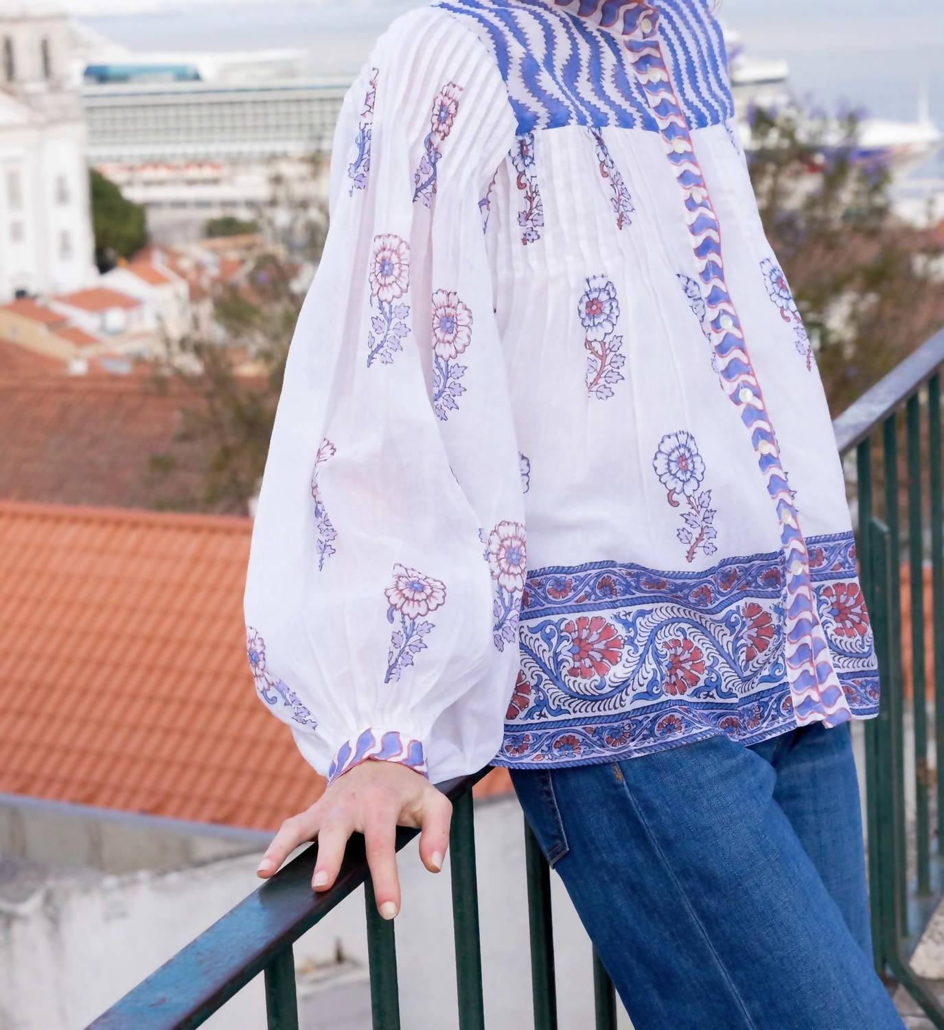 A timeless blouse that will never go out of style. Elevate your wardrobe with the Mandarin Blouse Top by Oliphant, a stunning piece in vibrant Sierra Blue perfect for any occasion. Featuring long balloon sleeves with tailored cuffs, this blouse is crafted from lightweight cotton voile adorned with hand block printed floral patterns. It boasts a refined Mandarin collar and is secured with elegant mother of pearl button closures. Care instructions: Hand wash.