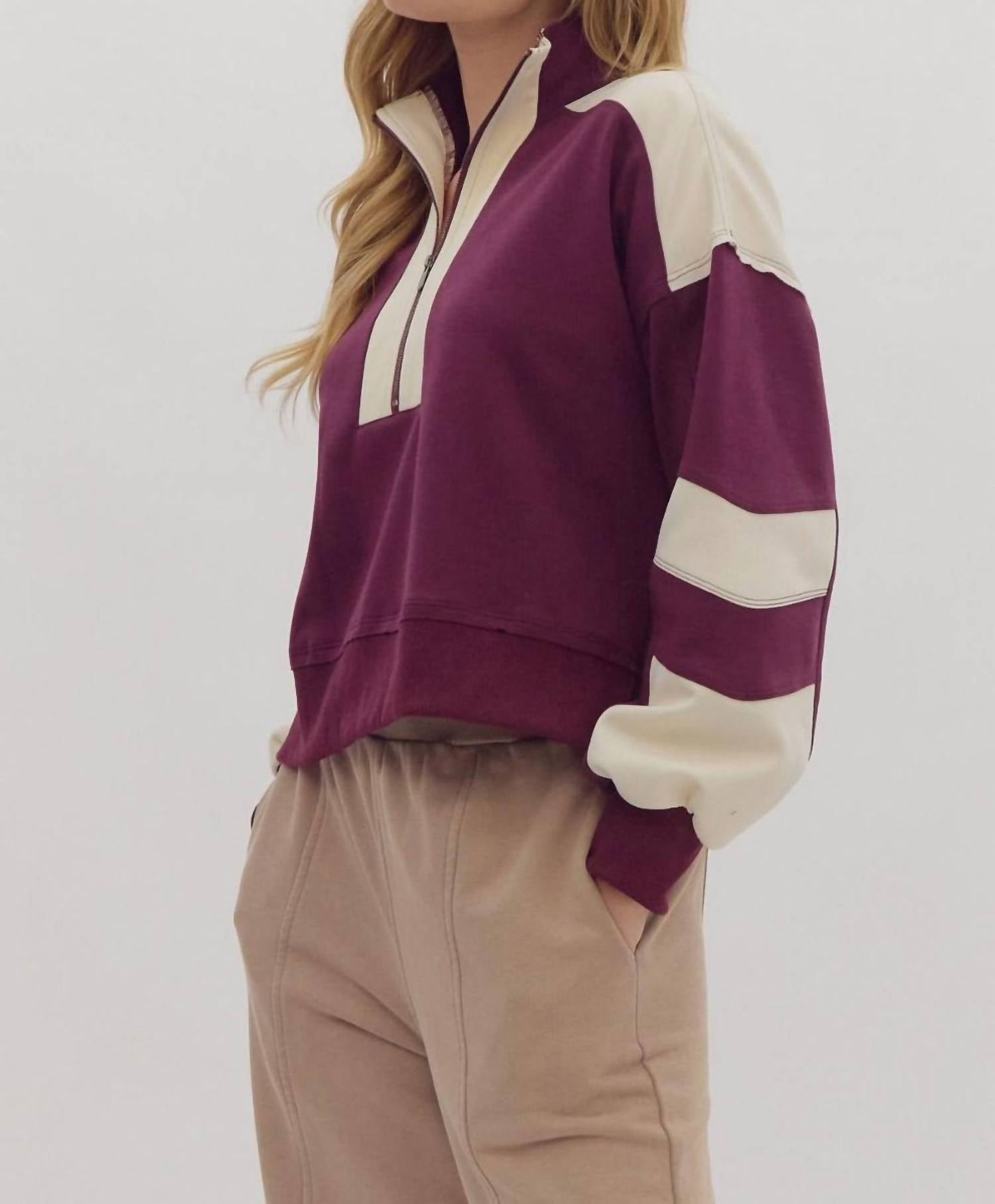 Fit to perfection and effortlessly chic. Introducing the Entro Half Zip Sweater in a sporty maroon tone, designed to keep you stylish on the go. This long sleeve top is crafted from soft cotton, featuring trendy colorblock details for a streetwear-inspired look. With a crewneck neckline and easy pull-on closure, it's perfect for casual travel or Thanksgiving gatherings. Effortlessly cool and comfy, this sweater requires machine wash care and line dry.