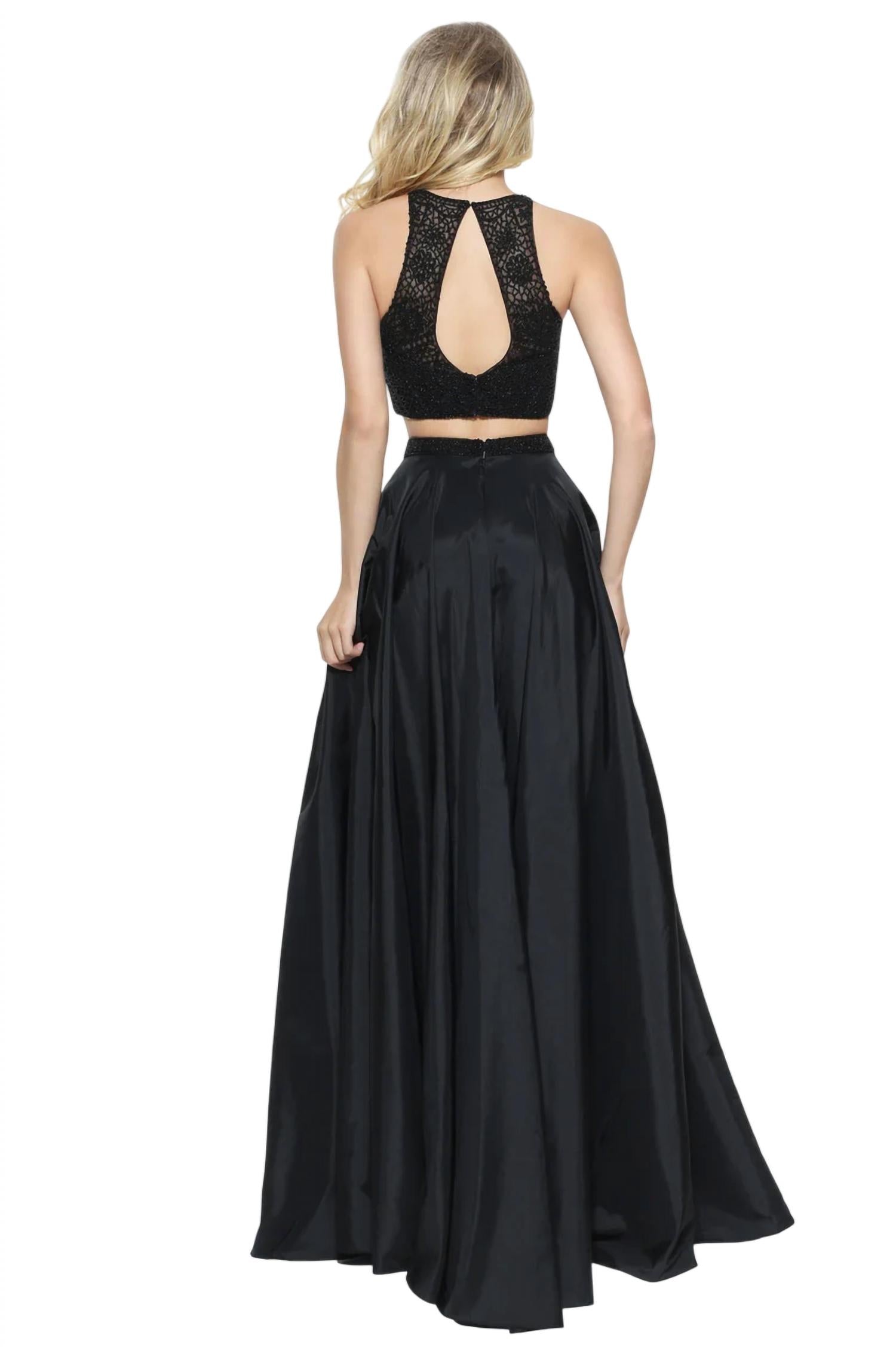 Features a high neck two piece. Beaded top. Key hole back. Taffeta A-line skirt. Full length.