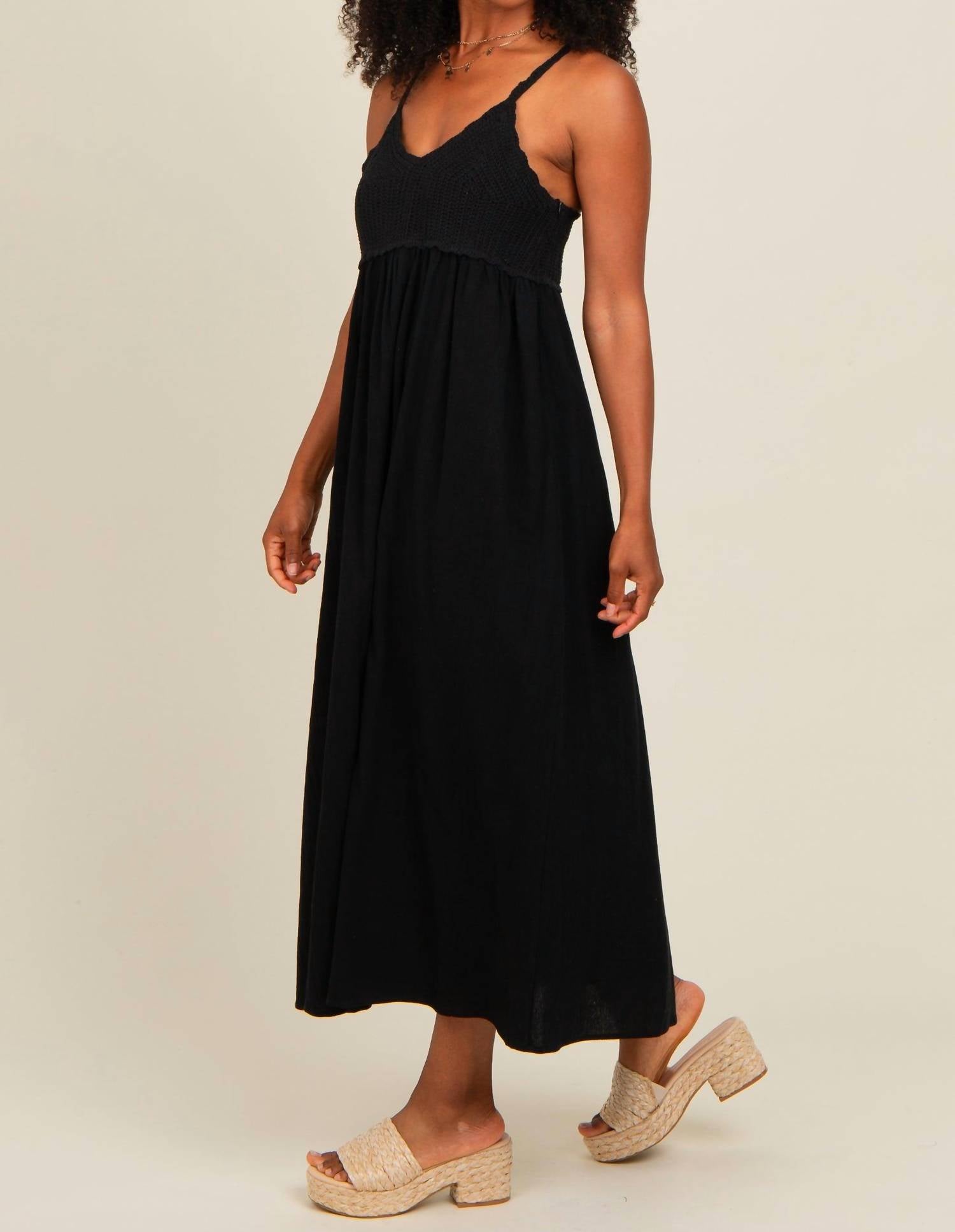 The perfect length dress does exist. Elevate your summer style with the Kamryn Crochet Midi Dress by So Me, a chic black A-line piece designed for effortless elegance. This sleeveless dress features intricate crochet detailing and a flattering V-neckline, perfect for vacation festivities or casual gatherings. Material: Crochet. Closure: Pull on. Model is wearing a size small (5'4" height, 33.5" chest, 27" waist, 38" hip, 27.5" inseam).