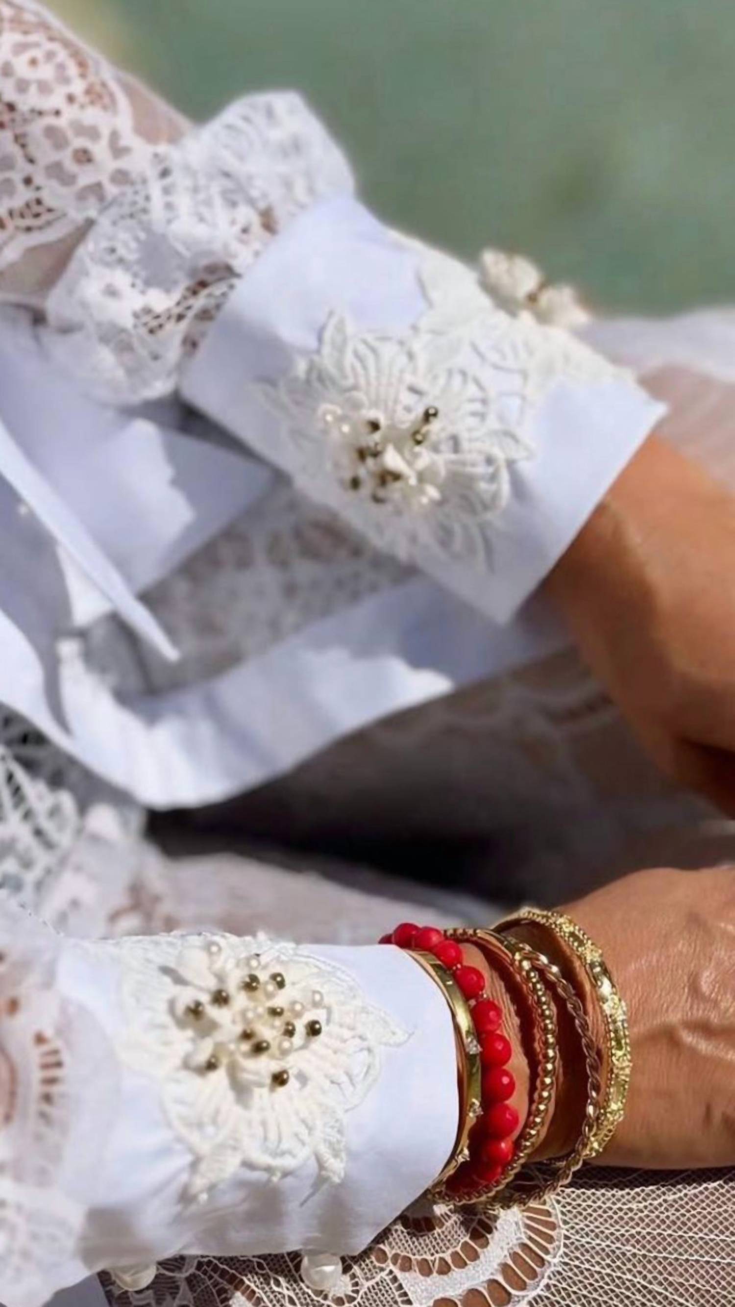You're going to want to pack this for your next vacation! Introducing the Chantilly Laces Cover Up Set by Amitee, a sophisticated two-piece ensemble perfect for beach days and summer occasions. This women's coverup in white features a refined design crafted from an 88% Cotton, 12% Elastane blend with cotton tricoline collar and hand-embroidered cuffs for artisanal detail. The set includes lace pants with mini mesh shorts as a lining for added comfort, offering full coverage in a stylish, patterned finish. For longevity, it is recommended to hand wash and dry in the shade.