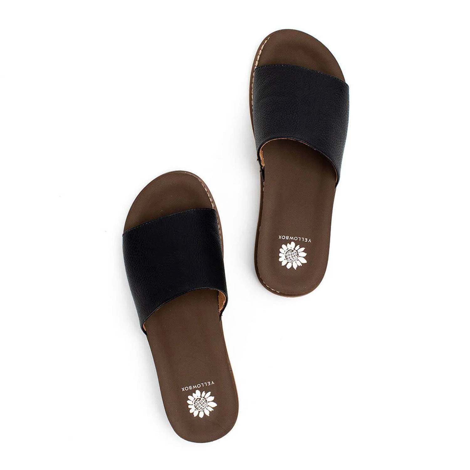Flowy dresses, cropped pants, and even jumpsuits... this sandal works with them all! Step into summer style with the Women's Kalo Slide Sandal by YELLOWBOX. These black sandals offer a modern minimalist flair with their faux leather construction and open toe design. Featuring a comfortable 1.5" flat heel and EVA footbed for cushioning, they are perfect for a beach day. Enjoy the balance of rustic vibe and functionality with its man-made outsole.