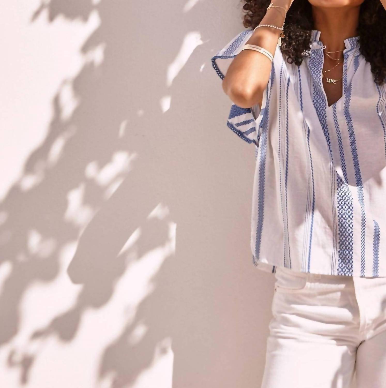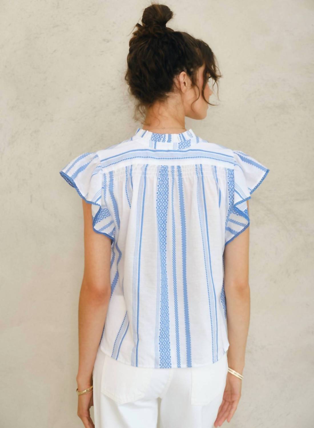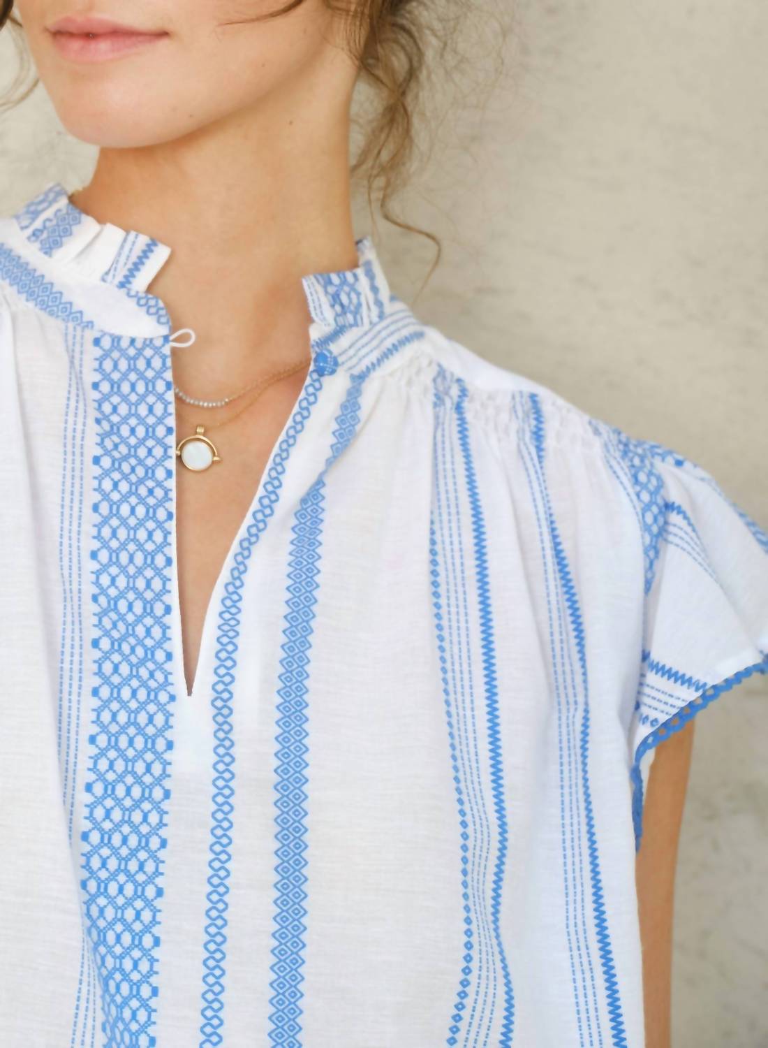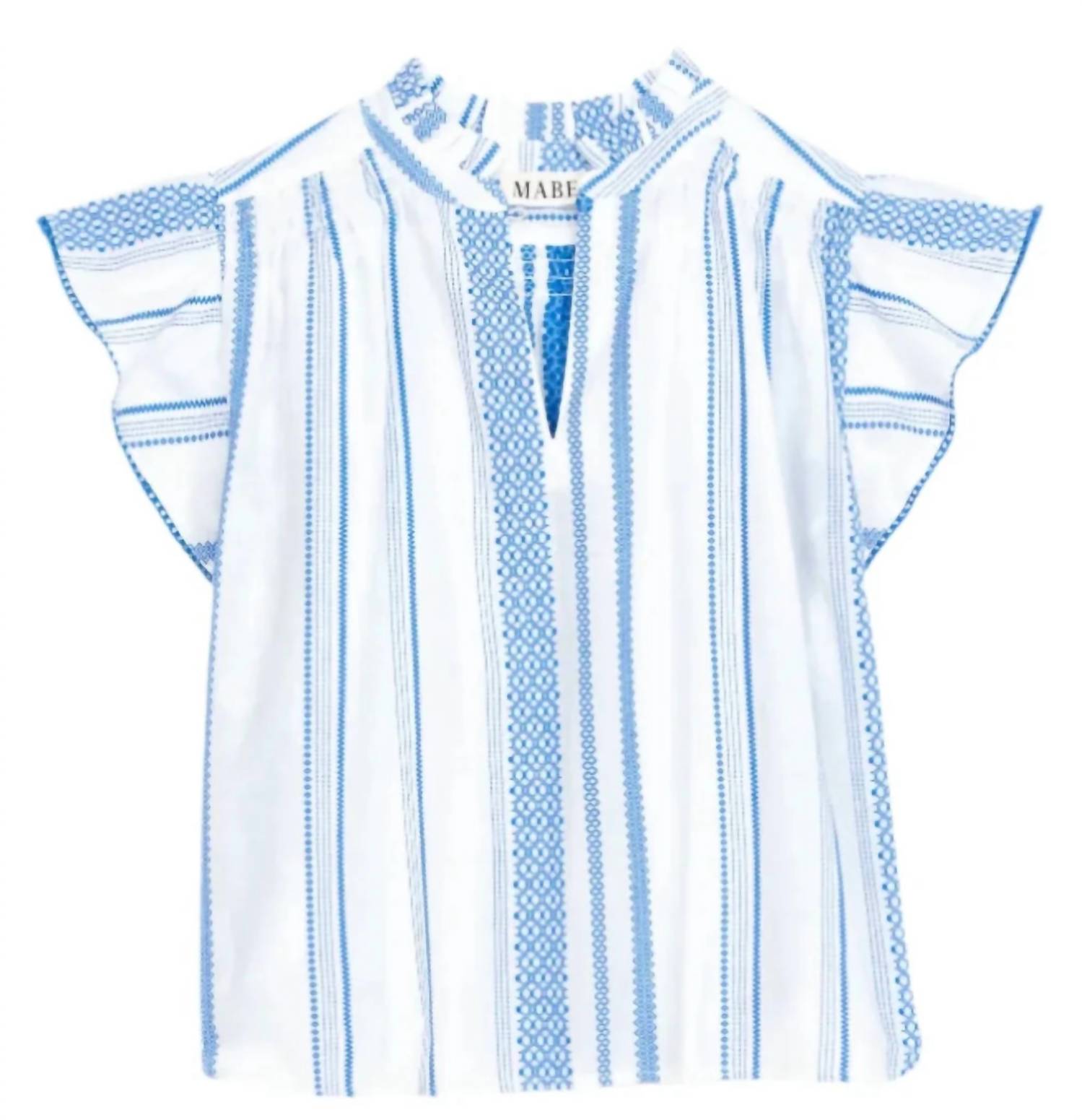 A timeless blouse that will never go out of style. The Alma V Neck Top by M.A.B.E. brings chic style to your spring wardrobe with its ruffled cap sleeves and elegant V-neck design. Crafted from 100% cotton, it features an eye-catching stripe pattern in blue with royal blue embroidery. With a pull-on closure, this top is perfect for vacation wear. Care for it by hand washing to maintain the crisp look of the fabric.