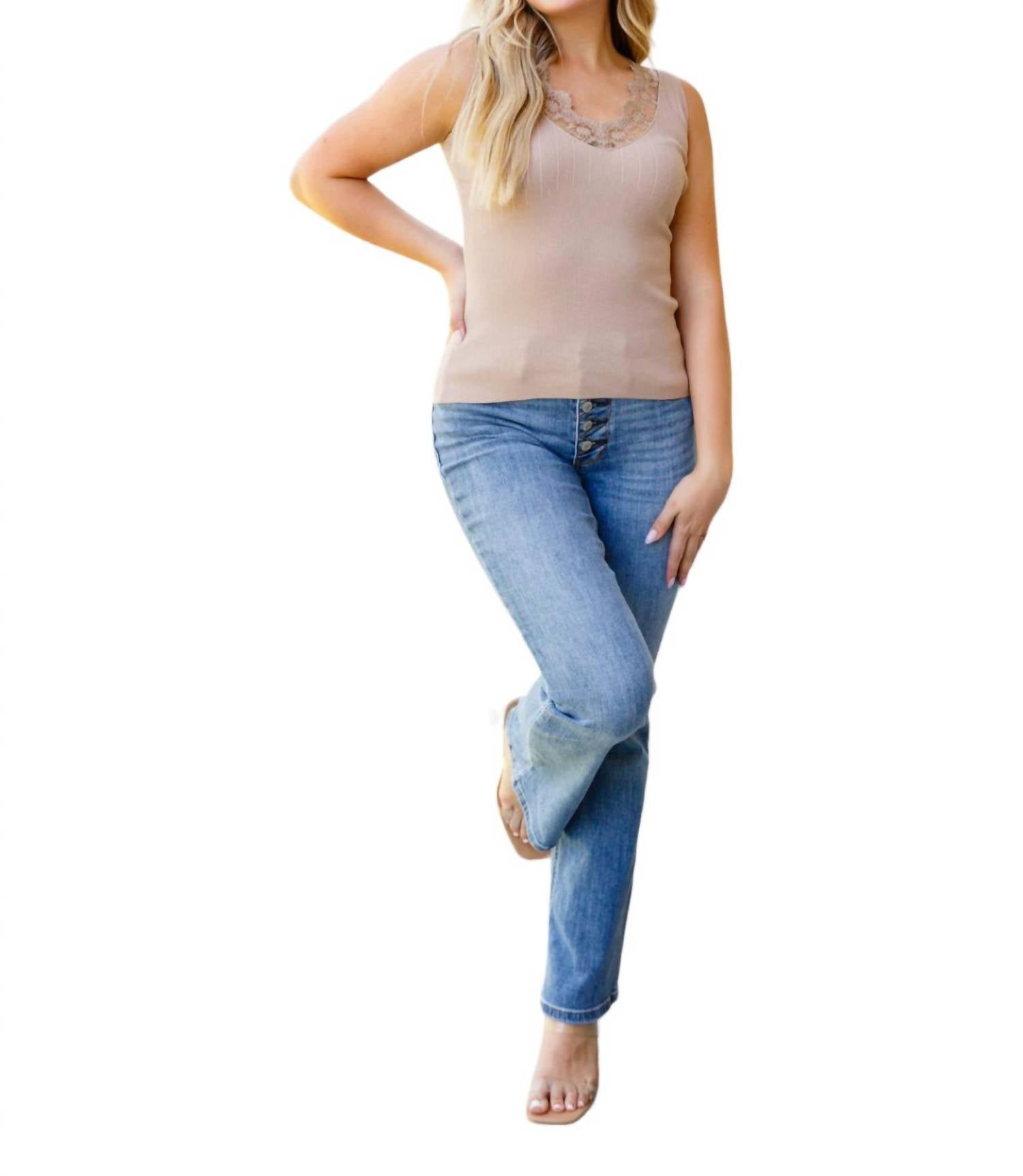 Lightweight Sweater Knit. V-Neckline. Lace Trim. Slim Fit. True to Size. 100% Polyester.