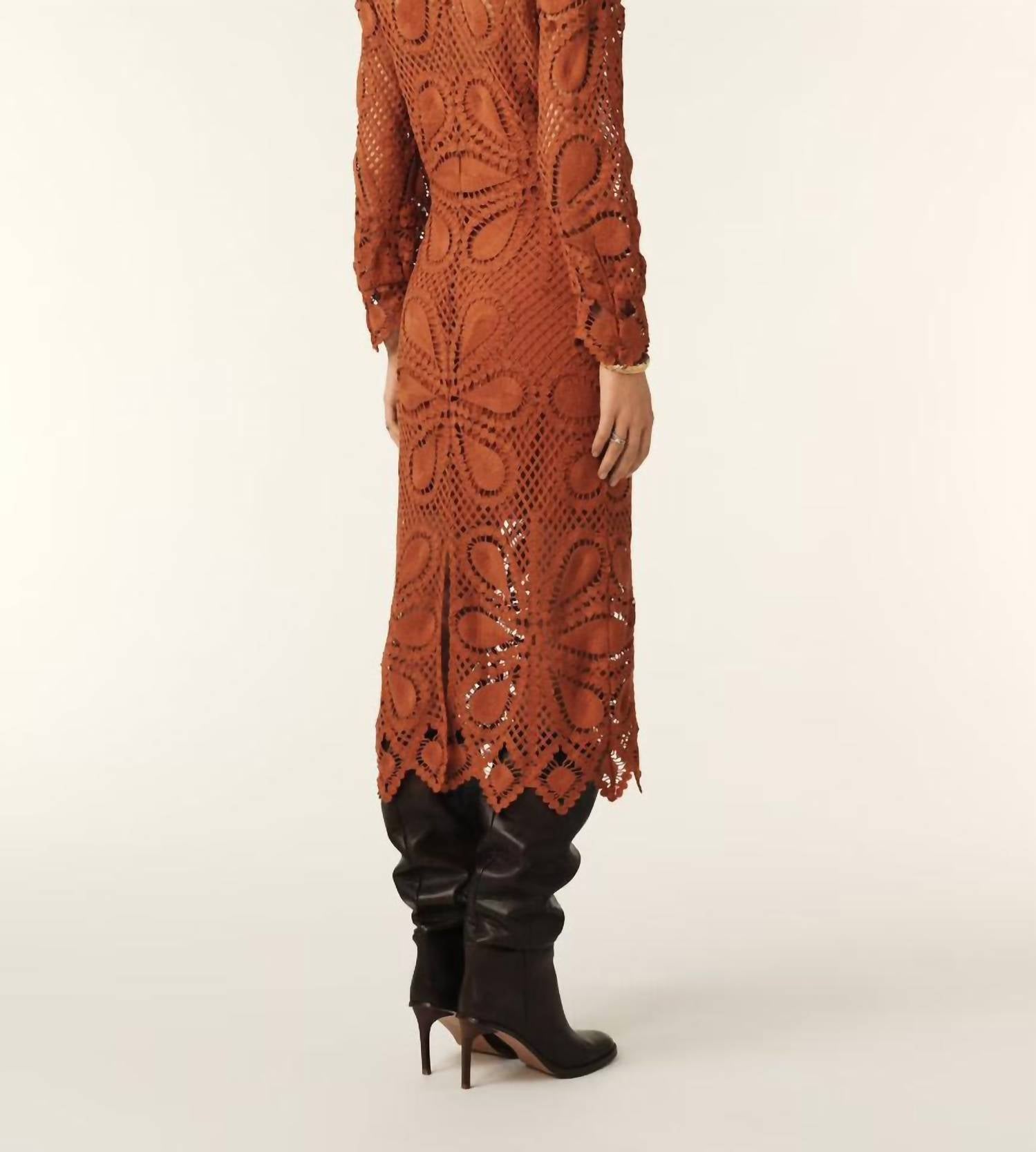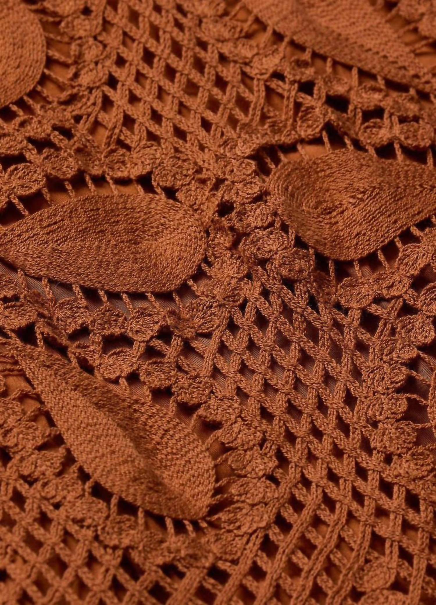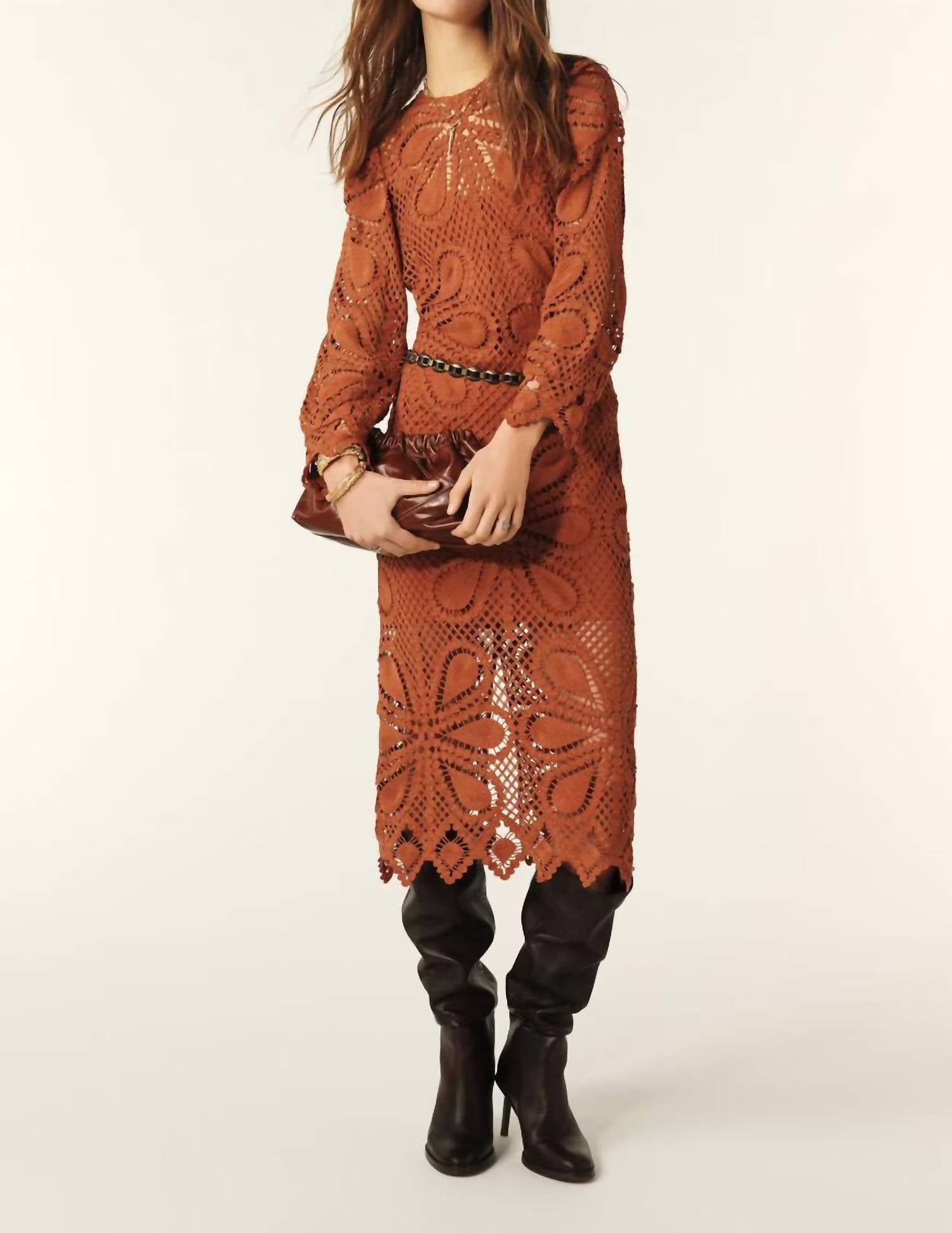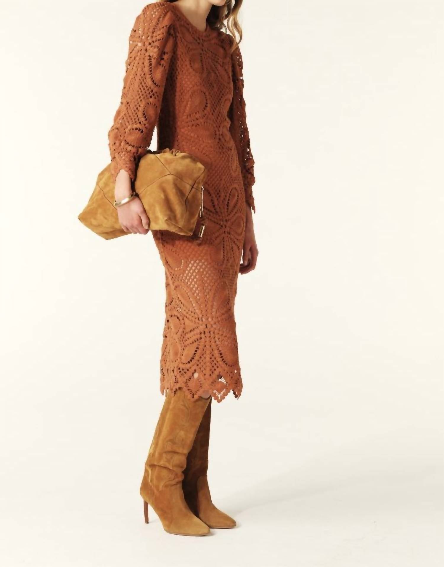 A midi dress so versatile, your options for wearing it are endless. Experience the effortless elegance of the Grace Midi Dress by Bash, a stunning choice in praline for any evening event. This boho chic piece features long sleeves and is crafted from cotton, offering both warmth and style with its A-line silhouette and crochet sweater design. Garment length is calf-length, ensuring a sophisticated appearance. Closure: Pull on. Care instructions: Machine wash, tumble dry.