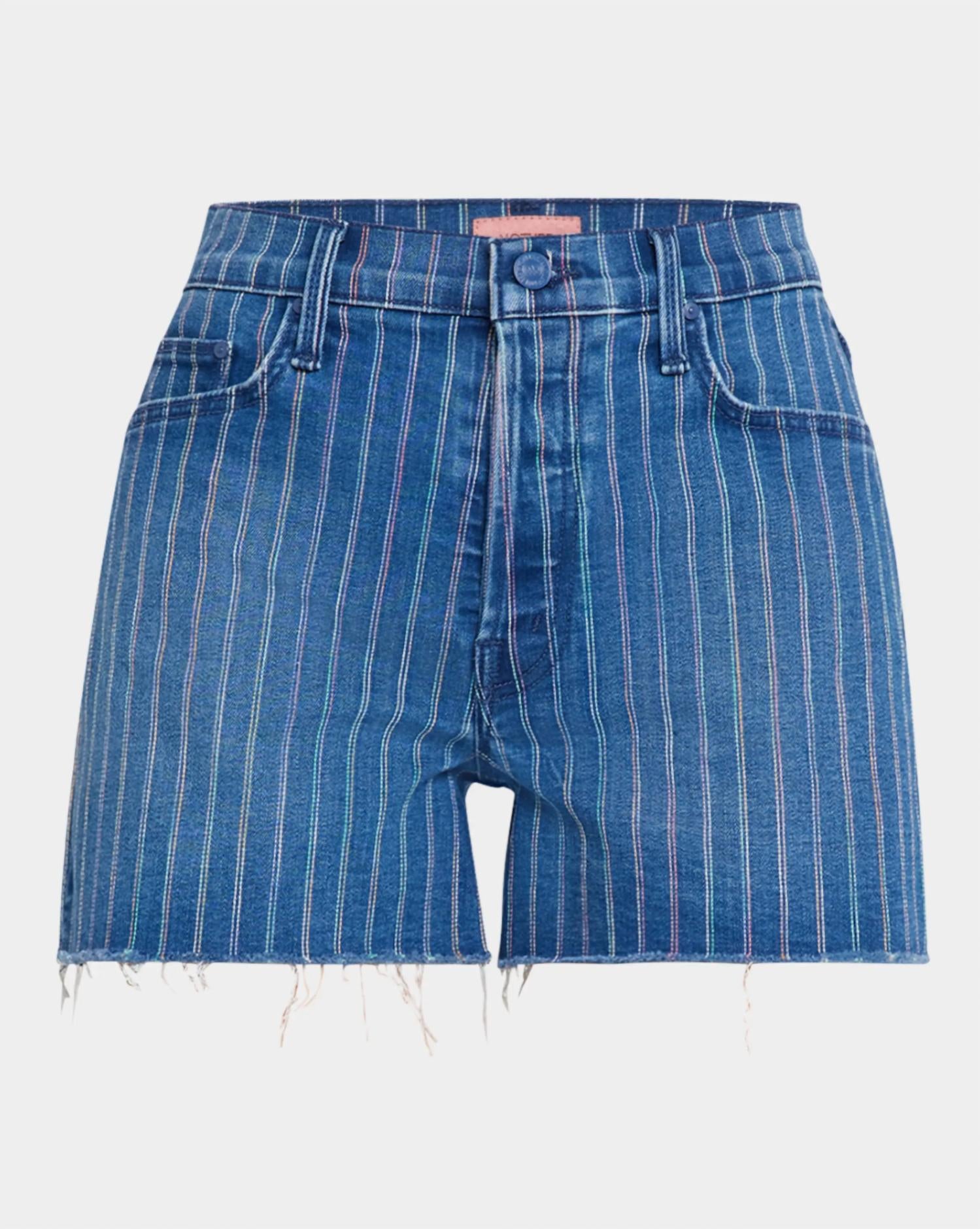 High-waist is here to stay and we especially love this style short. Embrace streetwear elegance with the MOTHER Skipper Long Fray Short in Sunglass Strolling, perfect for your next concert. These women's high-waist shorts are made from a cotton blend (77.5% Cotton, 21.5% Polyester, 1% Polyurethane) featuring a chic stripe pattern and a distressed pocket detail. Crafted in the USA, they ensure superior quality and style. Closure: Button closure.