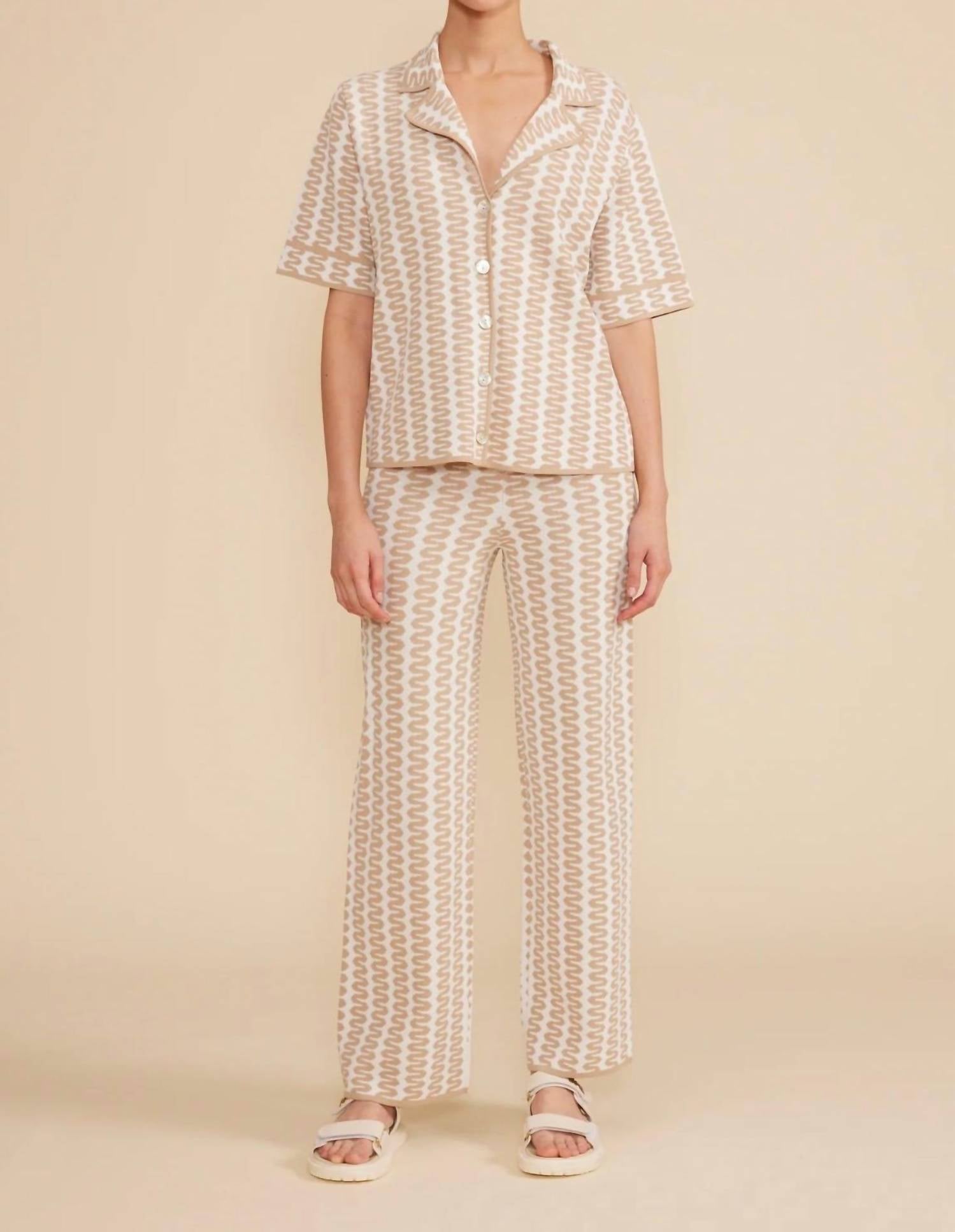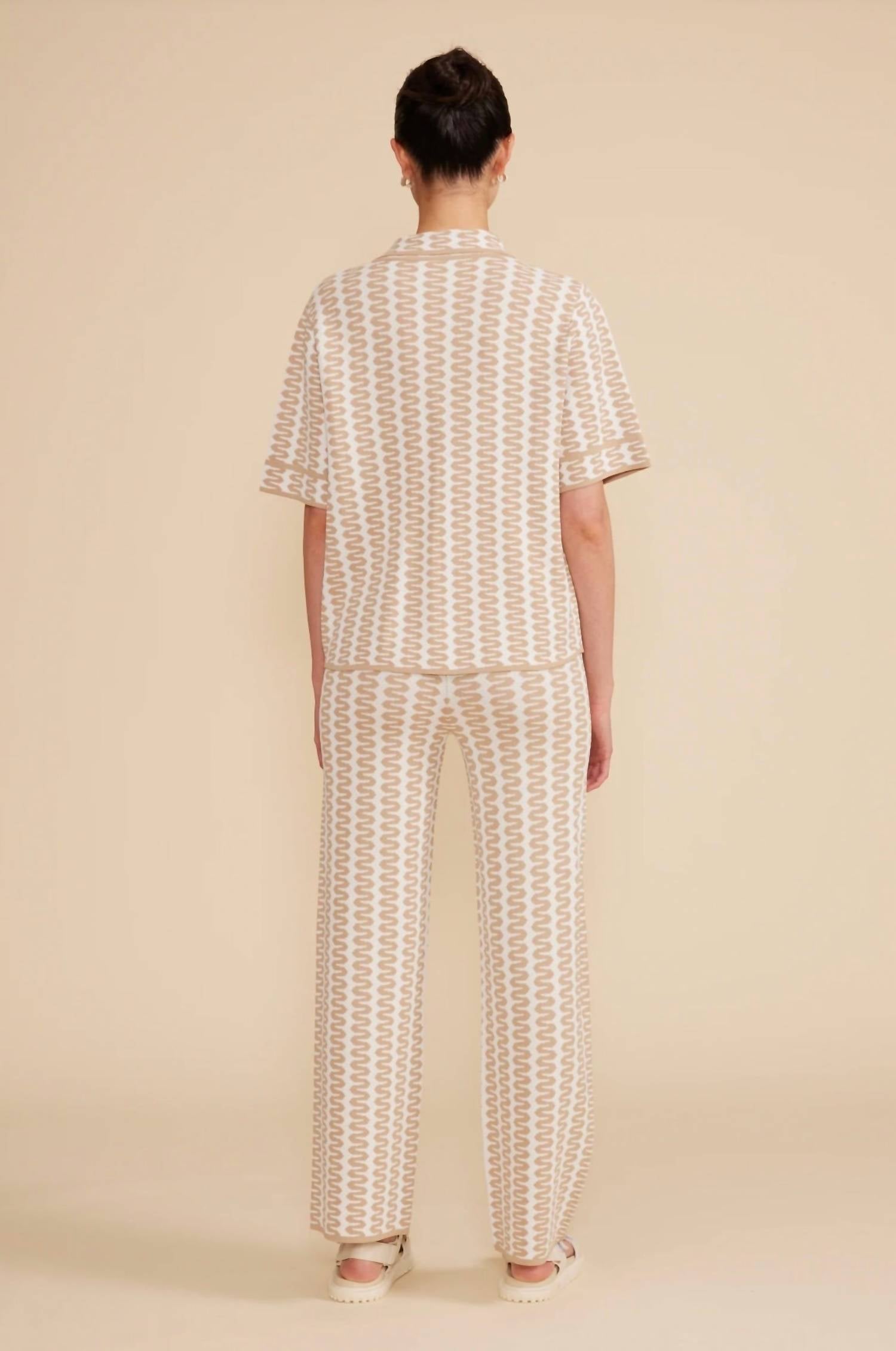 The short sleeve tee you'll want in every color. Introducing the Figi Knit Top by LUCY PARIS, showcasing a stunning tan cream hue with a minimalist pattern perfect for your summer wardrobe. Featuring short sleeves and a button closure, this top is crafted from 62% rayon and 38% polyester for a soft, luxurious feel. Ideal for a vacation-ready style, the collared design is perfect for casual Thanksgiving gatherings. Care instructions include hand washing and tumble drying.