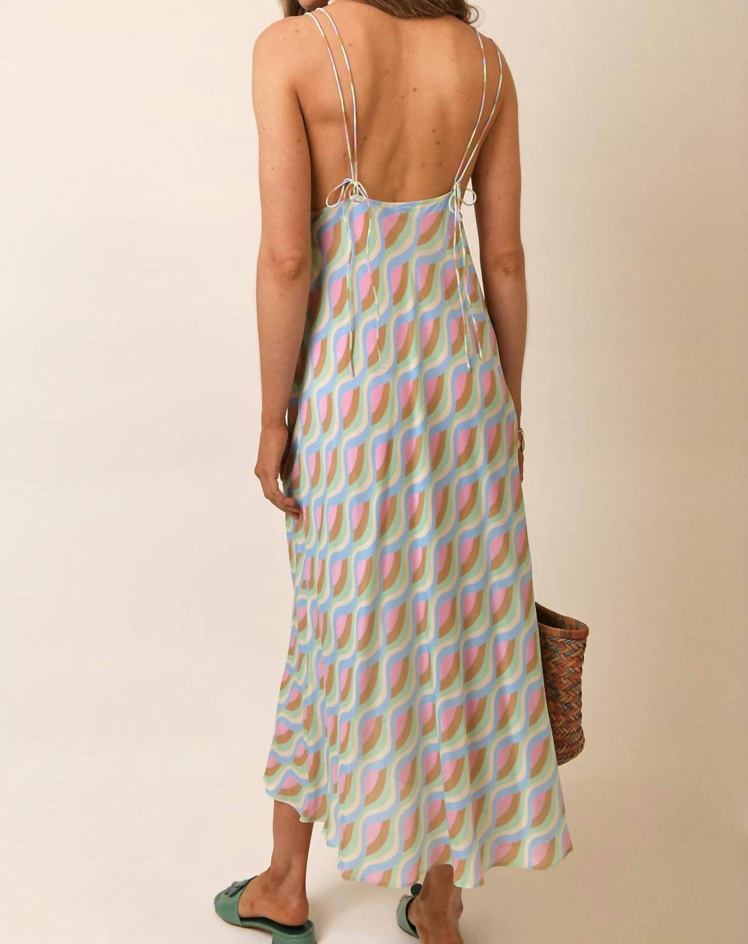 Just add slides or mules and you are good to go. Unveil your style with the Palermo Silk Midi Dress by RIXO, an exquisite choice for any summer occasion. Designed with spaghetti straps and a geo wave pattern, it features a sheath silhouette that gracefully falls to a midi length. The dress is made from luxurious silk, offering a soft and smooth feel against the skin. Finished with a charming sweetheart neckline and tie closure, it requires dry cleaning and can be tumble dried for easy maintenance.