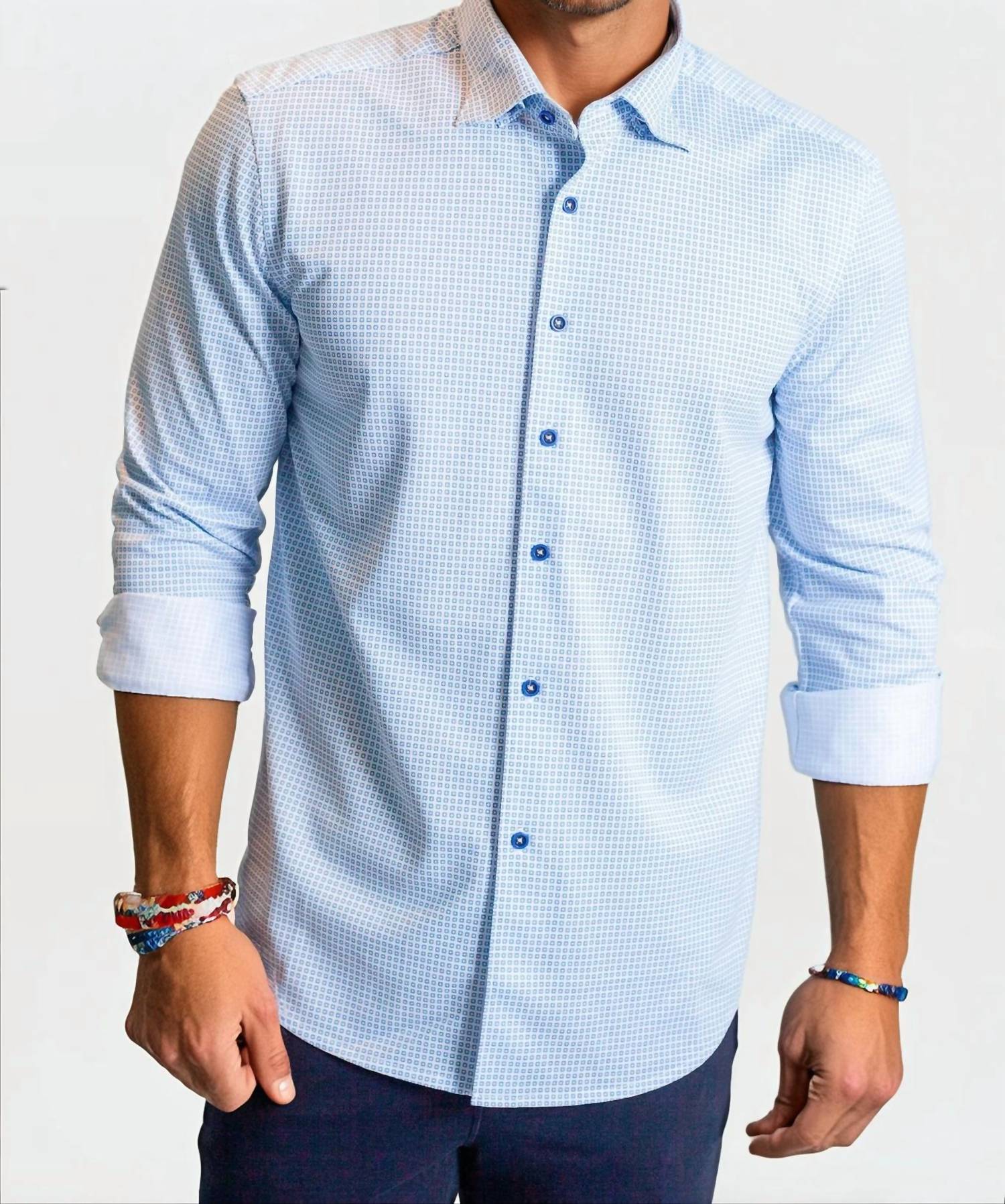 Discover unparalleled comfort with the Buki Square Up Long Sleeve Tech Shirt in a cool blue hue, perfect for any occasion. This men's classic features long sleeves, a button closure, and a stylish collar, crafted from a patterned, wrinkle-resistant fabric that incorporates four-way stretch and cooling yarn for superior moisture-wicking and temperature regulation. Expertly designed for a clean and untucked look, this shirt promises maximum ease of wear with its technical benefits. Simply machine wash to maintain its polish and incredible comfort, a seamless transition from workweek formality to weekend relaxation.