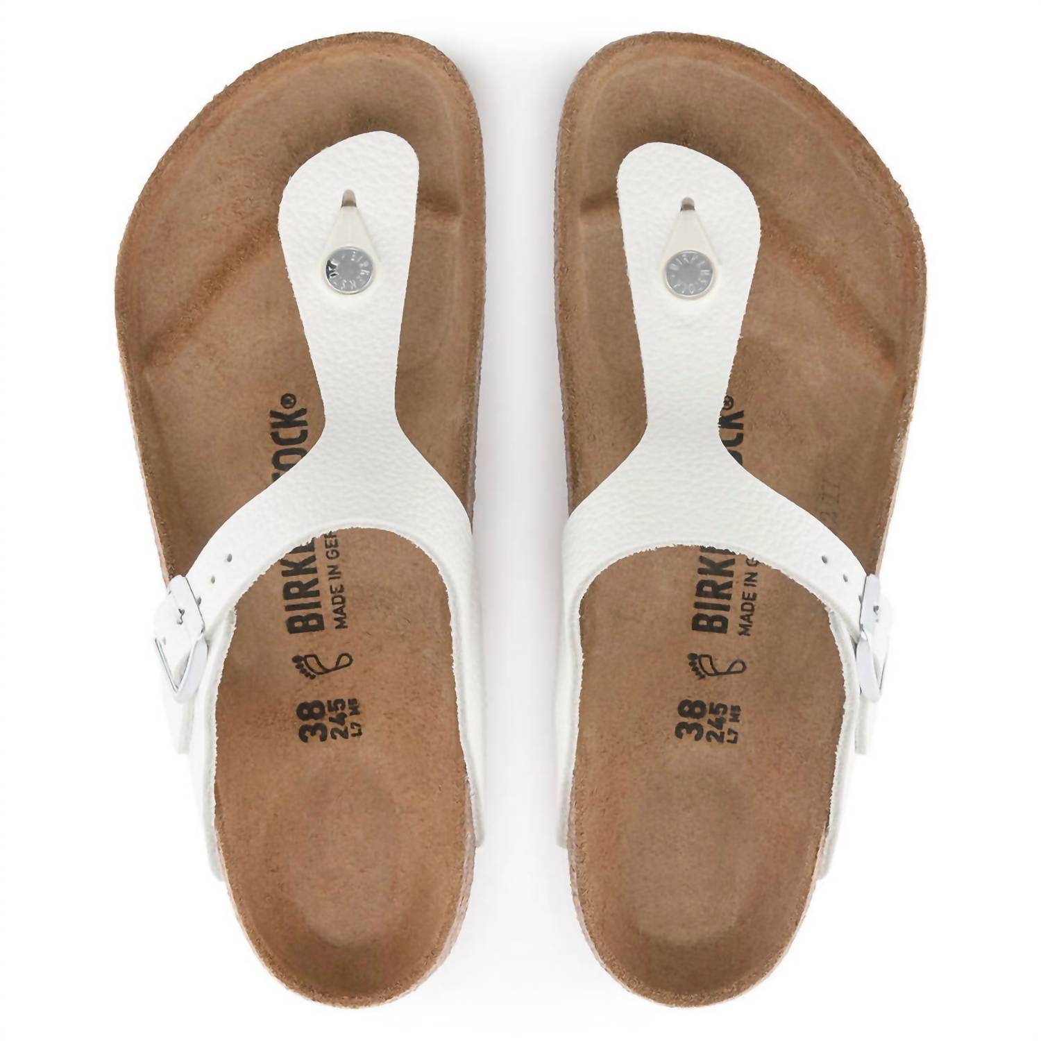 This sandal will take you from brunch to dinner and everything in between. Experience the iconic Women's Gizeh Leather Sandal by BIRKENSTOCK, offering minimalist elegance in a stylish white hue. Made from high-quality natural leather, this sandal showcases an anatomically shaped cork-latex footbed with a suede lining for ultimate comfort. Featuring an open toe design with a flat heel, it includes a thong style and an adjustable metal pin buckle for a personalized fit. This refined and supportive sandal, perfect for spring dinner parties, is proudly "Made in Germany" and features a durable EVA sole.